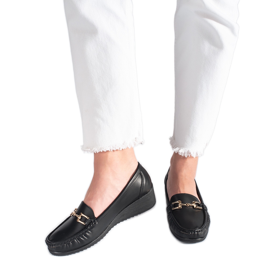 Les mocassins sont en cuir écologique de haute qualité, ce qui leur donne non seulement un look élégant, mais assure également le confort toute la journée. L'intérieur est fini avec l'imitation de la peau, et la semelle intérieure textile supplémentaire les rend extrêmement confortables. Construits sur un coin stable d'une hauteur de 4 cm, ils garantissent la hauteur et le soutien appropriés des pieds.