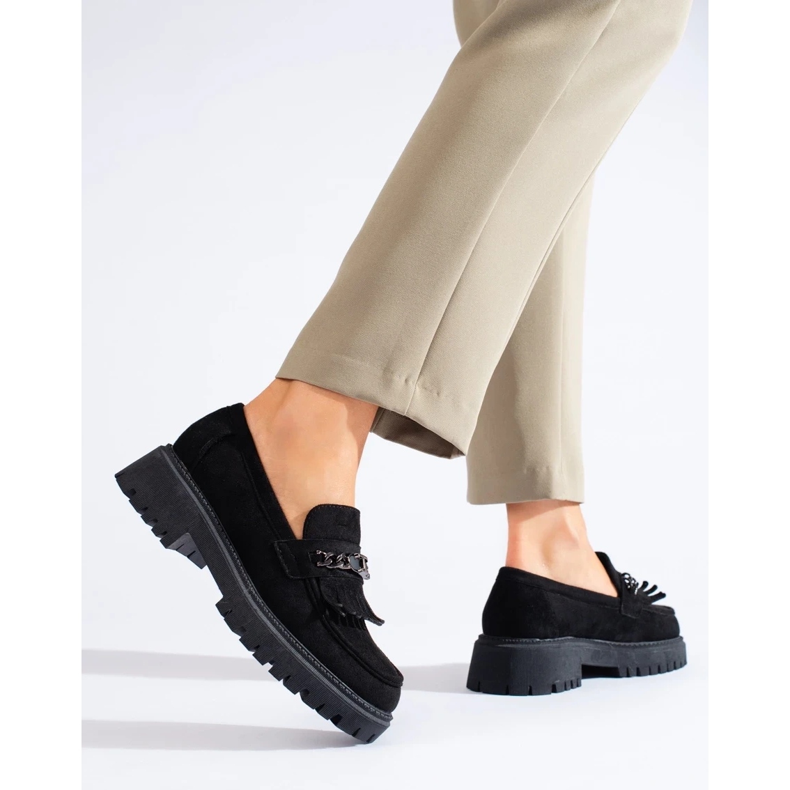 Élégant et confortable - Mandis noirs Shelovet combinez une coupe classique avec un accent à la mode sous la forme d'une chaîne décorative. Fabriqués en daim en cuir écologique doux, ils sont parfaits pour le bureau et pour les sorties quotidiennes. La plate-forme de 4,5 cm de haut donne un ascenseur subtil sans renoncer à confort.