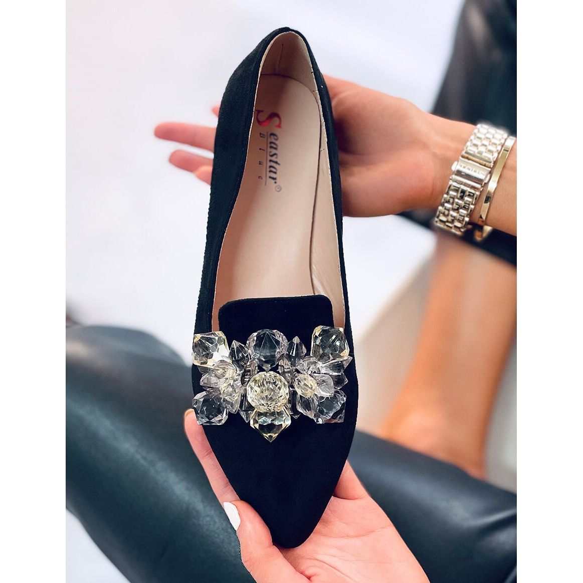 Une décoration subtile sous forme de pierres brillantes sur le devant des mocassins attire l'attention et ajoute du chic à n'importe quel style. Ces détails permettent de combiner les chaussures aussi bien avec des ensembles quotidiens que plus formels, en les adaptant facilement à diverses occasions.