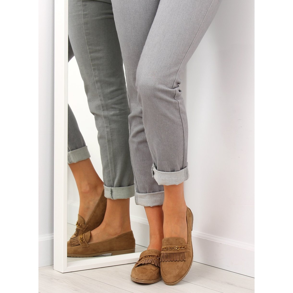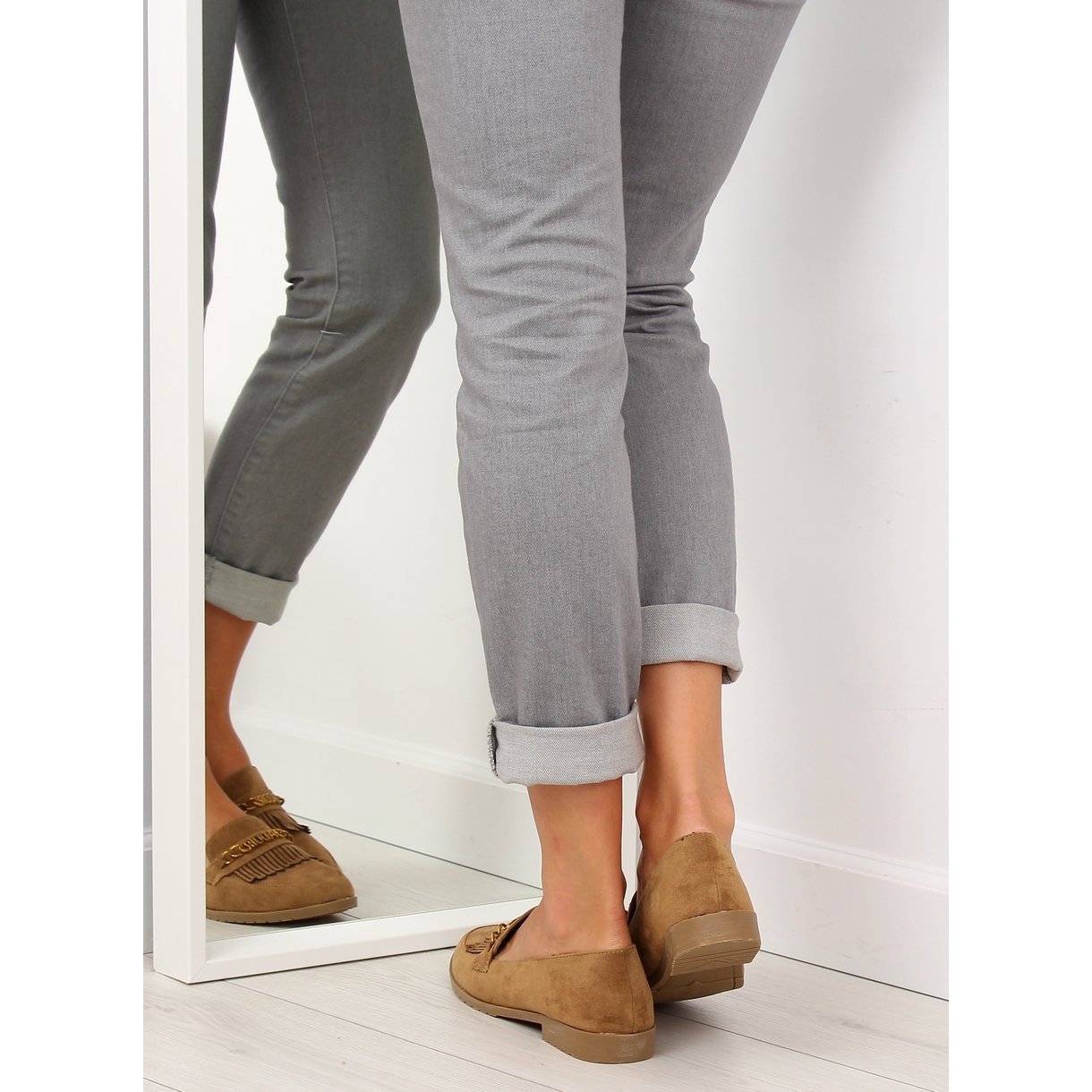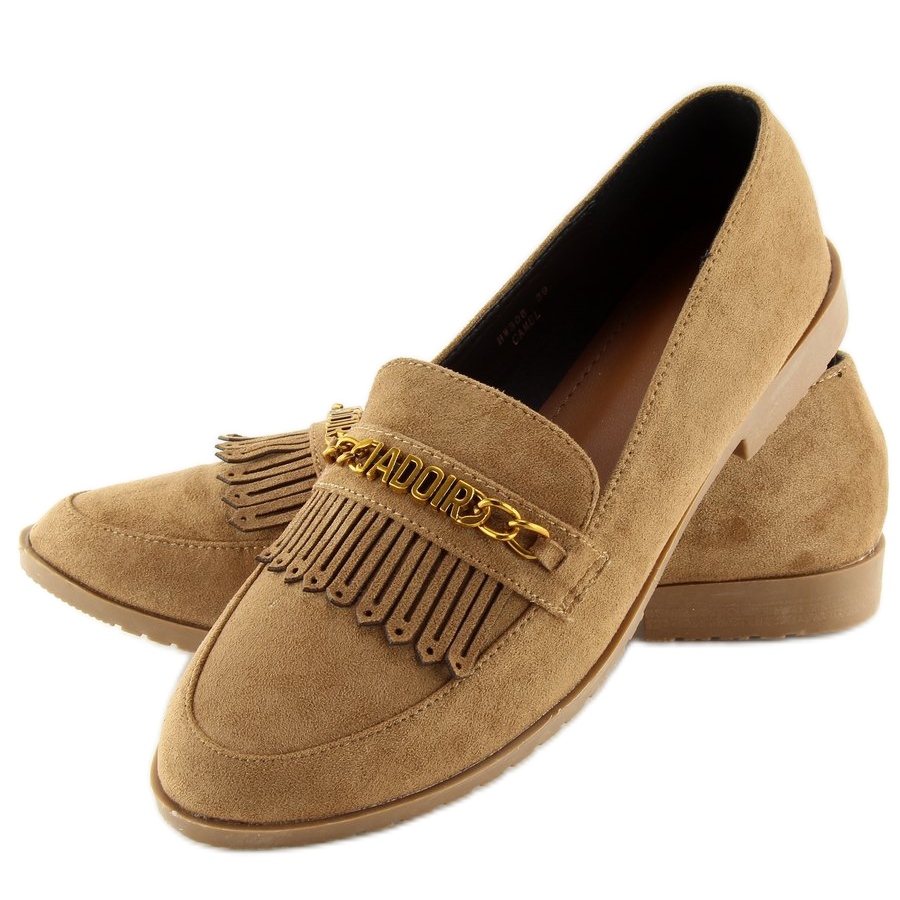 Découvrez l'élégance et le confort avec les mocassins marron HW308 Camel pour femme. Ces chaussures intemporelles, confectionnées en cuir suédé écologique de haute qualité, allient une coupe classique à un design moderne. Une subtile décoration dorée avec des franges leur confère un caractère unique, ce qui en fait un complément parfait à tout style automnal.