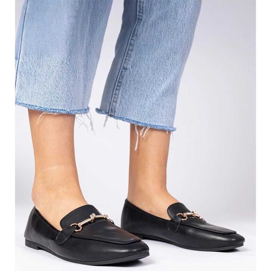 Détails: Mocassins noirs avec une décoration dorée et du zircon le noir