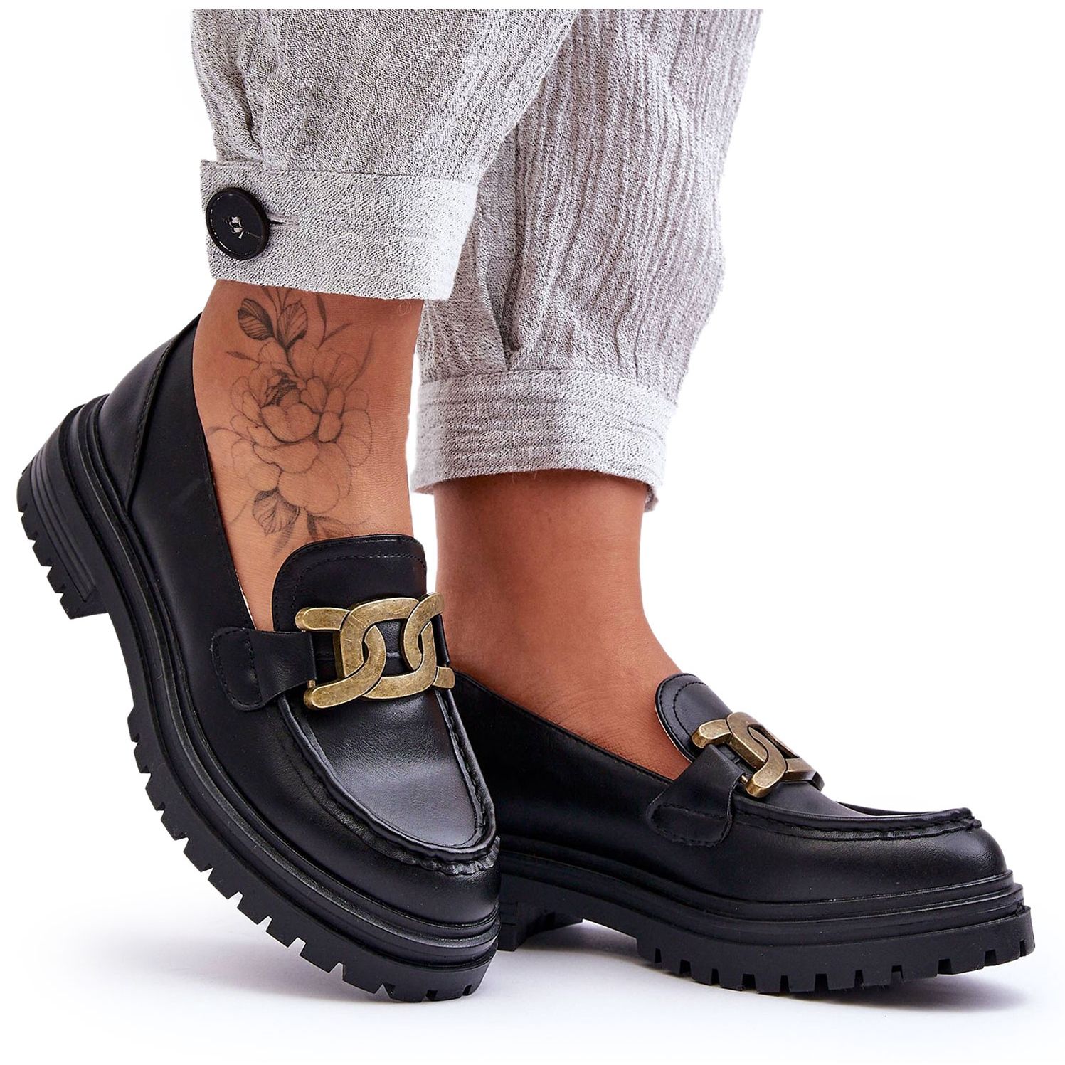 La couleur noire des chaussures est complétée par une décoration dorée en forme de chaîne sur le devant, qui confère aux mocassins un caractère unique et élégant. Une décoration simple mais efficace attirera l'attention et ajoutera de l'élégance à n'importe quel style - des jeans décontractés aux pantalons et jupes élégants.