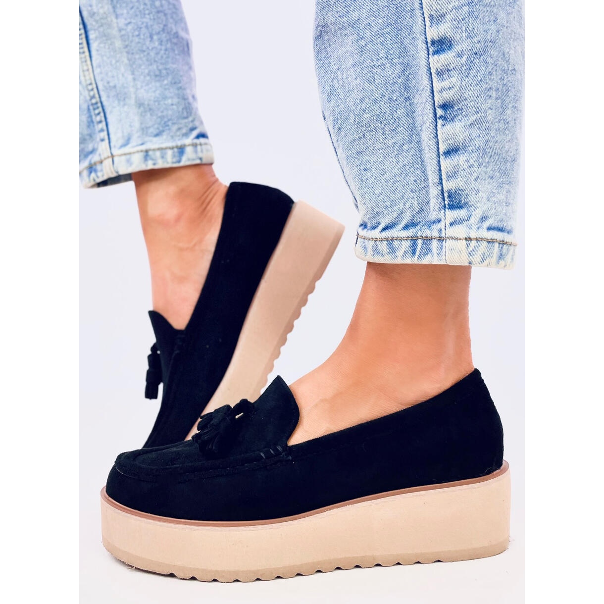 Découvrez l'élégance et le confort dans les stylisations de tous les jours grâce aux mocassins sur la plate-forme Black Templin. Ces mocassins noirs en daim se réjouissent de leur coupe simple, qui a été enrichie de franges décoratives, leur donnant un caractère quelque peu unique.