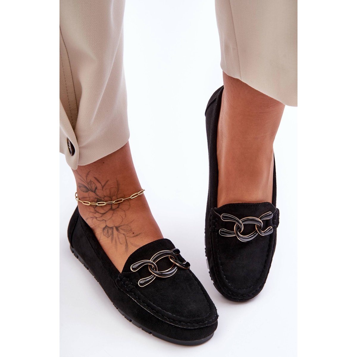 Mocassins plats en daim pour femme PG1 Noir Appia sont des mocassins élégants et classiques pour femme. Ils sont faits de daim écologique en noir. Les mocassins se caractérisent par une semelle plate et un bout arrondi. Il y a une décoration en plastique sur le devant de la chaussure.