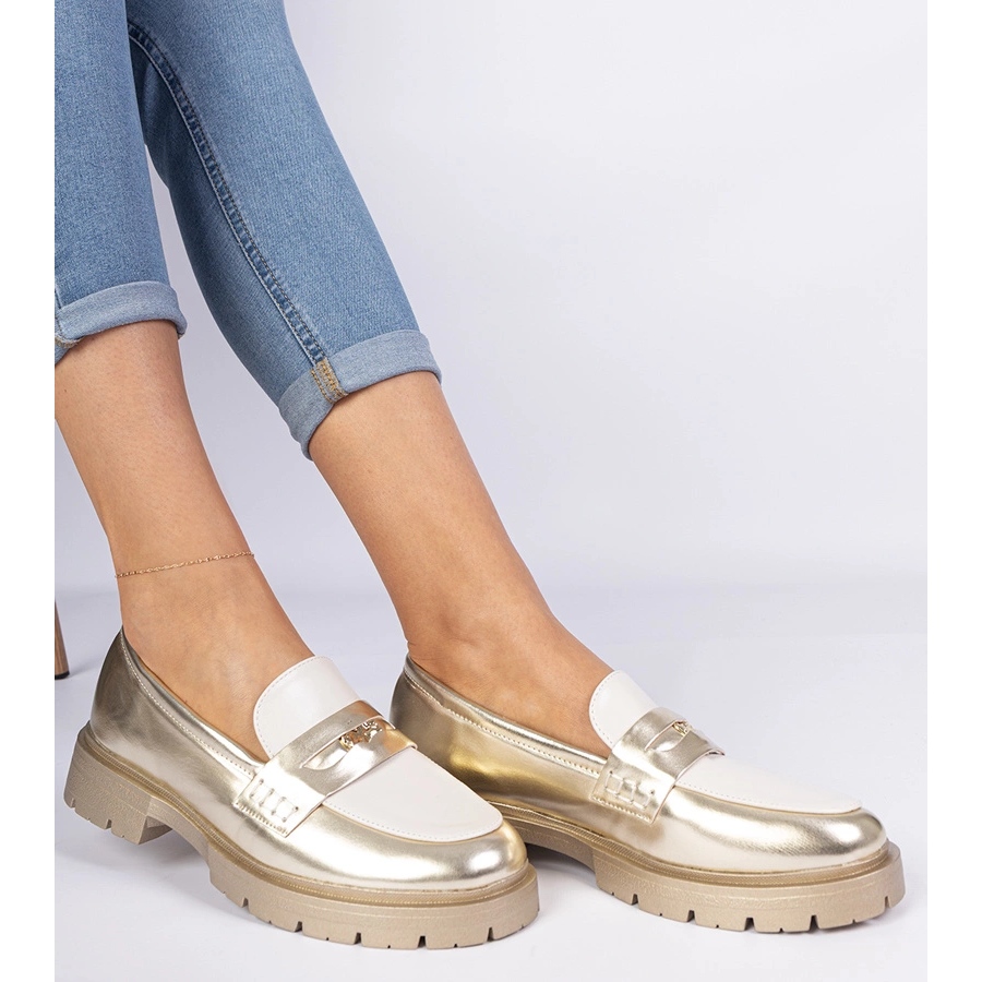 Détails: Mocassins pour femmes dorés avec un insert blanc blanche