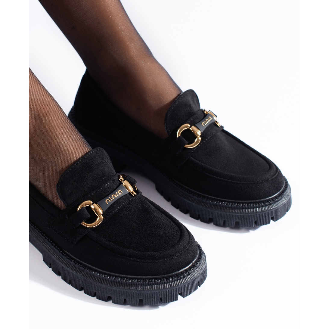 Ces chaussures uniques sont fabriquées en cuir suédé écologique de haute qualité, ce qui prouve l'approche responsable de la marque envers l'environnement et le soin des animaux. Les mocassins noirs seront un complément parfait à la fois à l’ensemble de bureau et aux tenues décontractées de tous les jours. La caractéristique qui les distingue des autres produits similaires sur le marché est une chaîne en or qui ajoute de l'élégance et un peu d'extravagance.