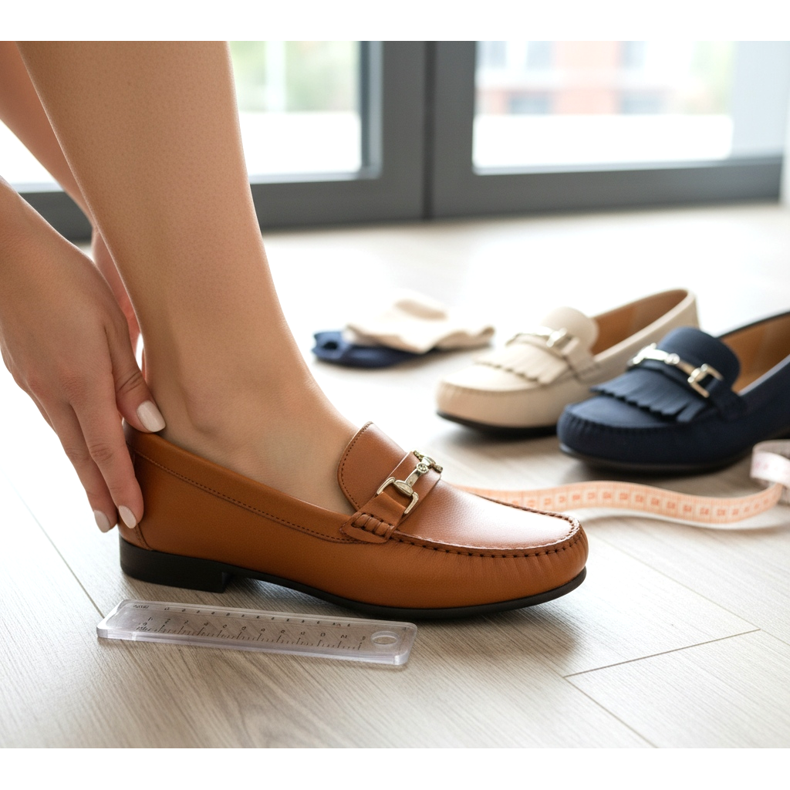 Longueur du pied c'est la mesure de base. Les mocassins doivent s'ajuster doucement au talon et disposer d'un espace d'environ 0,5 à 1 cm devant les orteils. Des chaussures trop serrées seront serrées, des chaussures trop lâches tomberont en marchant.