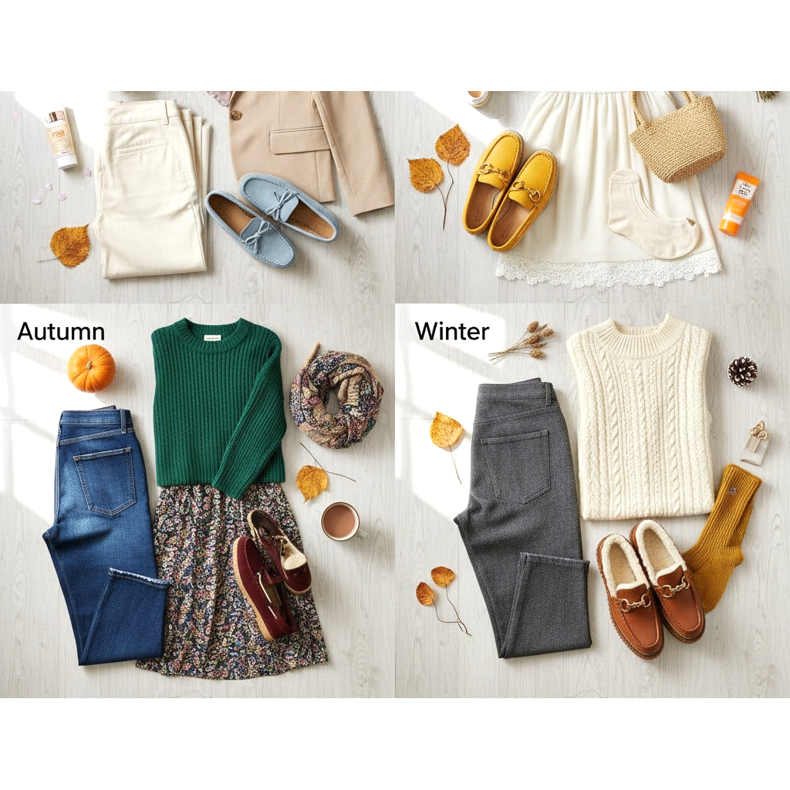 L'été nécessite des matériaux respirants. Choisissez des mocassins en toile, des modèles mules à talon ouvert ou des mocassins de conduite légers. Les couleurs claires – blanc, crème, jaune – mettront en valeur le bronzage. N'oubliez pas les pieds invisibles pour éviter les pieds en sueur.