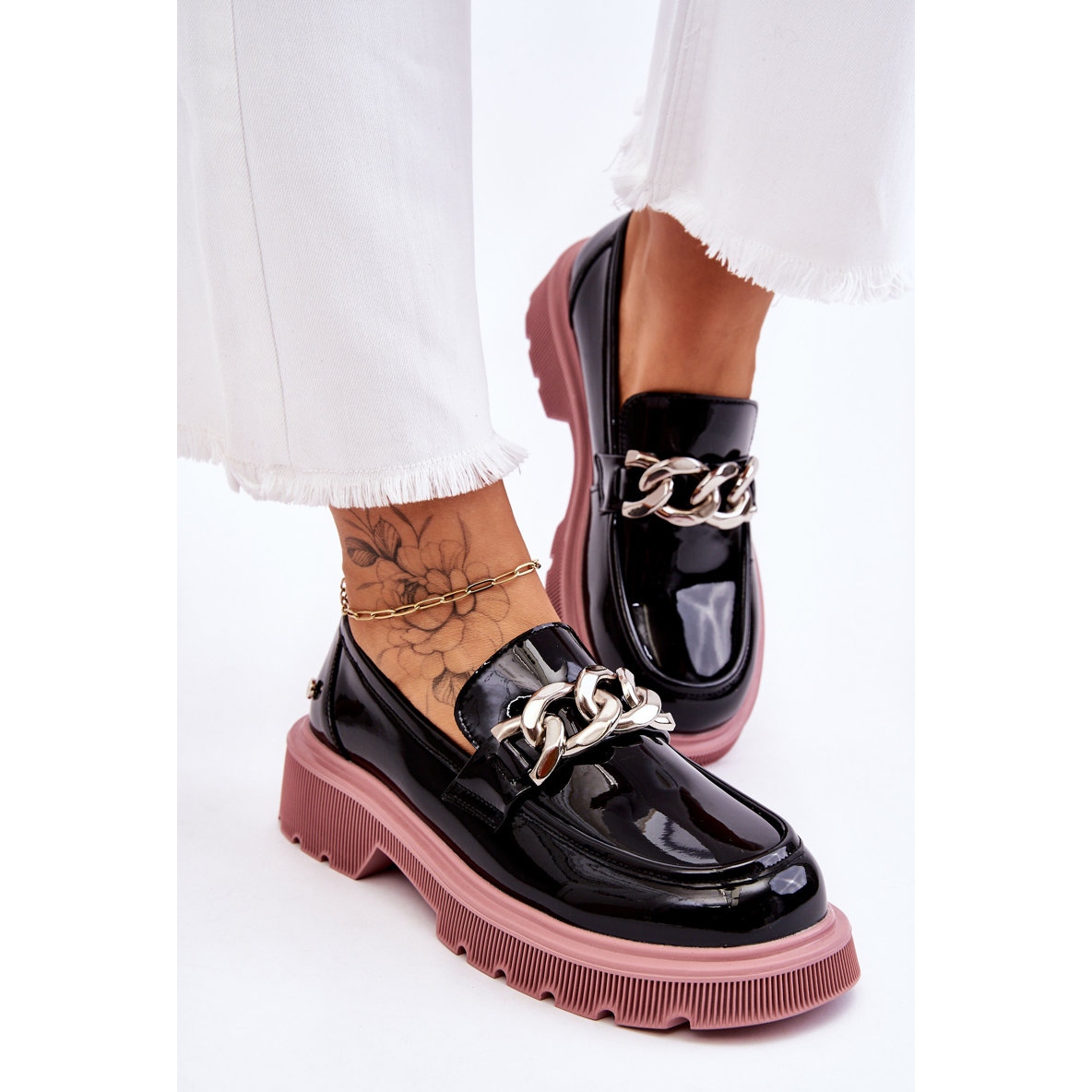 Locons pour femmes peintes Goe LL2N4039 - Élégance avec un soupçon de prédation. Une coupe noire classique en cuir naturel dans une finition verni avec un brillant subtil, décoré d'une chaîne plastique à la mode. Le modèle, sur un talon plat avec la plate-forme, combine la commodité du port de tous les jours avec une apparence efficace - idéale pour le bureau et pour les rassemblements sociaux.