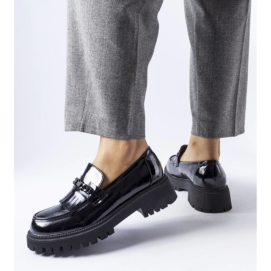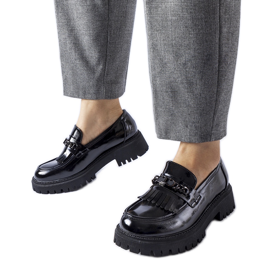 Les mocassins sont fabriqués en cuir écologique verni de haute qualité, ce qui les rend extrêmement impressionnants. La finition noire souligne leur caractère raffiné, et des éléments supplémentaires sous forme de boucle et de franges leur donnent une touche tendance.