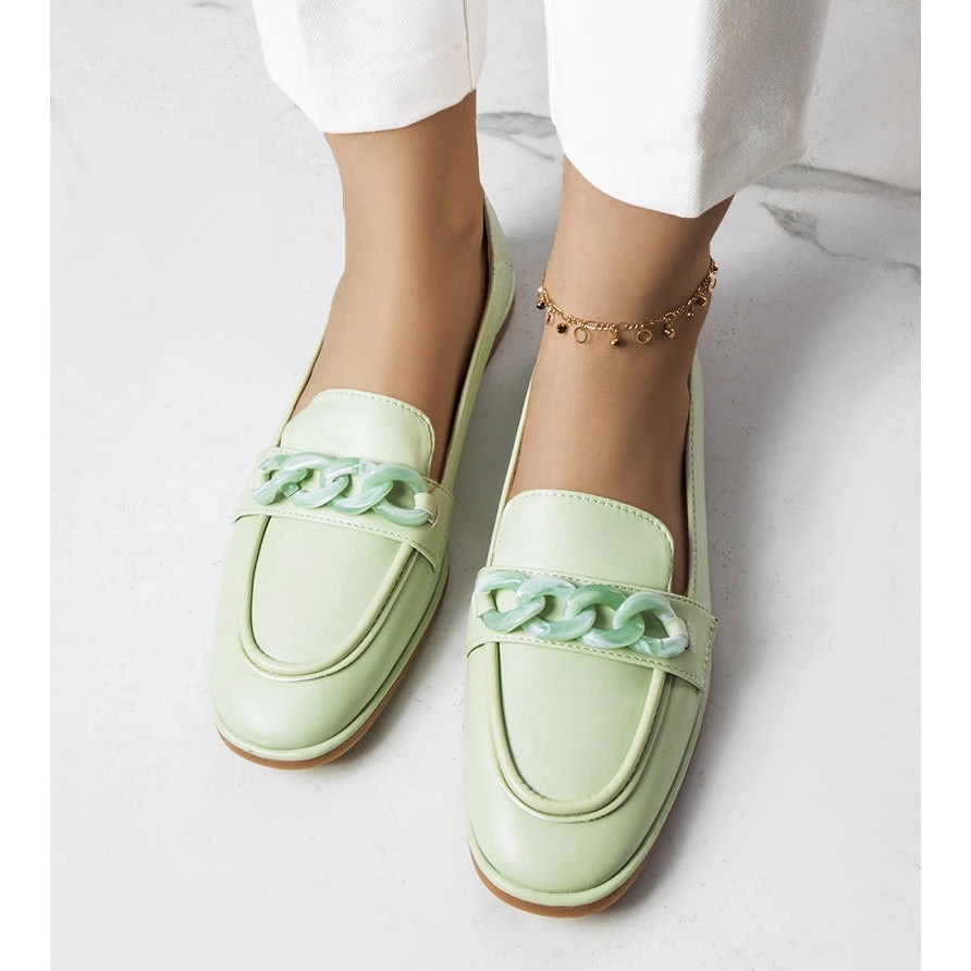 Les mocassins verts ornés d'une chaîne sont l'essence de l'élégance alliée au confort. Cette édition de chaussures classiques pour femmes est un mariage de design traditionnel et de tendances contemporaines, répondant parfaitement aux besoins des femmes modernes qui apprécient à la fois le confort et l'apparence unique.