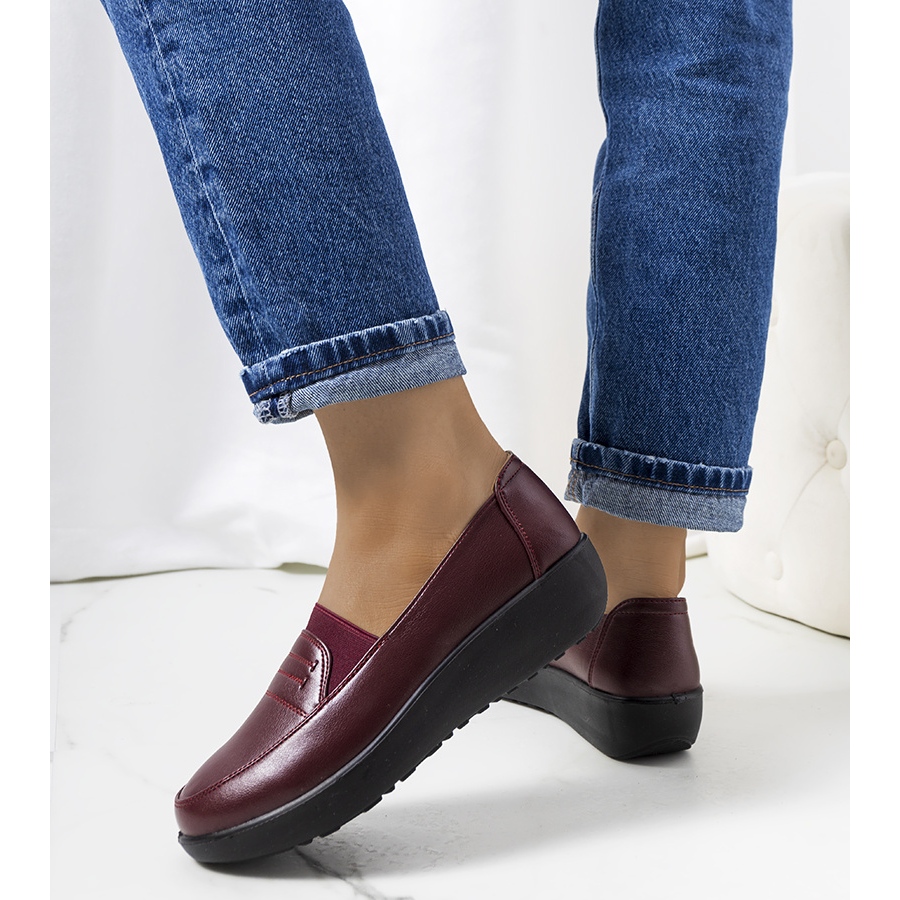 Les mocassins sont disponibles dans les tailles du 36 au 41, ce qui signifie que chaque femme trouvera le modèle qui lui convient. La couleur rouge et bordeaux avec une semelle noire se marie parfaitement avec les styles printaniers. De plus, l'insert en cuir garantit un confort tout au long de la journée.