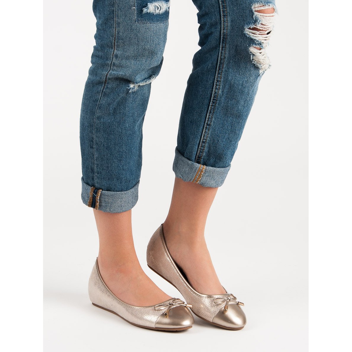 Ces ballerines se distinguent par une couleur subtilement brillante combinant des nuances d'or et de jaune, qui donne un accent spectaculaire et accrocheur à votre tenue. Sans motif, mais avec des décorations intéressantes et un charmant nœud, ils ajoutent de l'élégance à n'importe quelle tenue.
