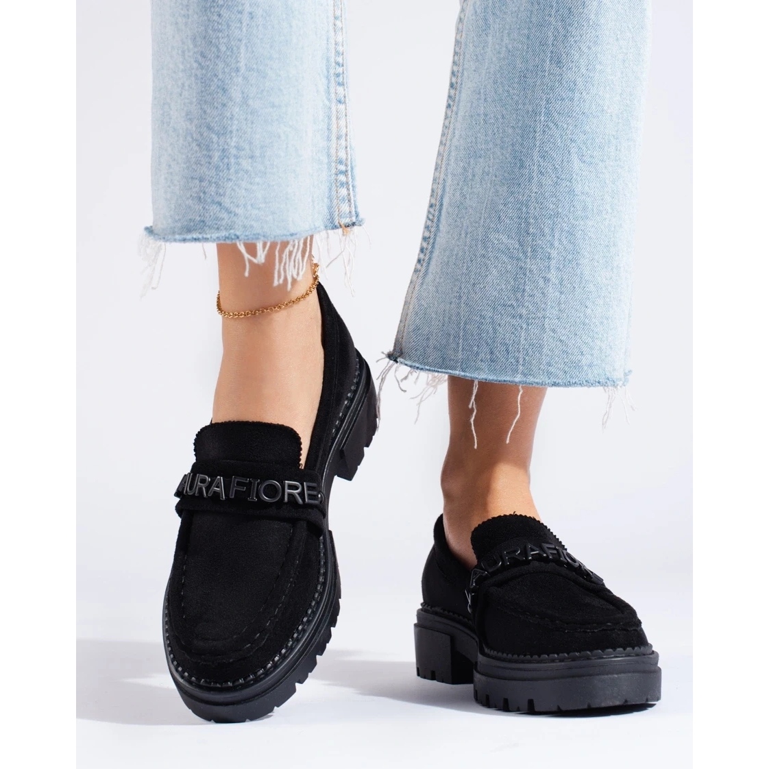 Muisseaux LA.fi élégants et confortables en daim écologique noir classique - idéal pour les stylisations quotidiennes et plus formelles. La combinaison de la coupe à la mode avec des solutions pratiques garantit un confort tout au long de la journée.
