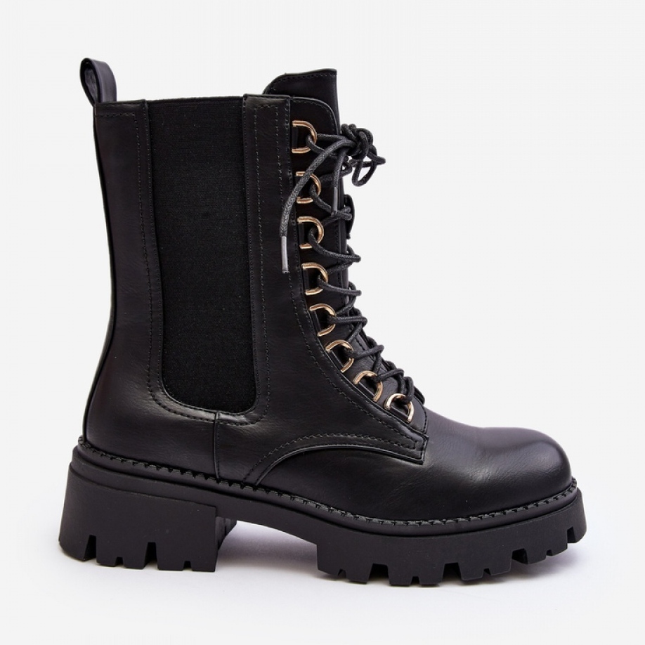 Bottines pour femmes en cuir écologique. Monté sur un talon plat. Inserts élastiques sur la tige. Bouts arrondis. Ce modèle se ferme avec une fermeture éclair sur le côté et dispose en plus d'un laçage. L'intérieur est isolé avec une couverture à chaussures. Un superbe modèle pour l'automne et l'hiver !