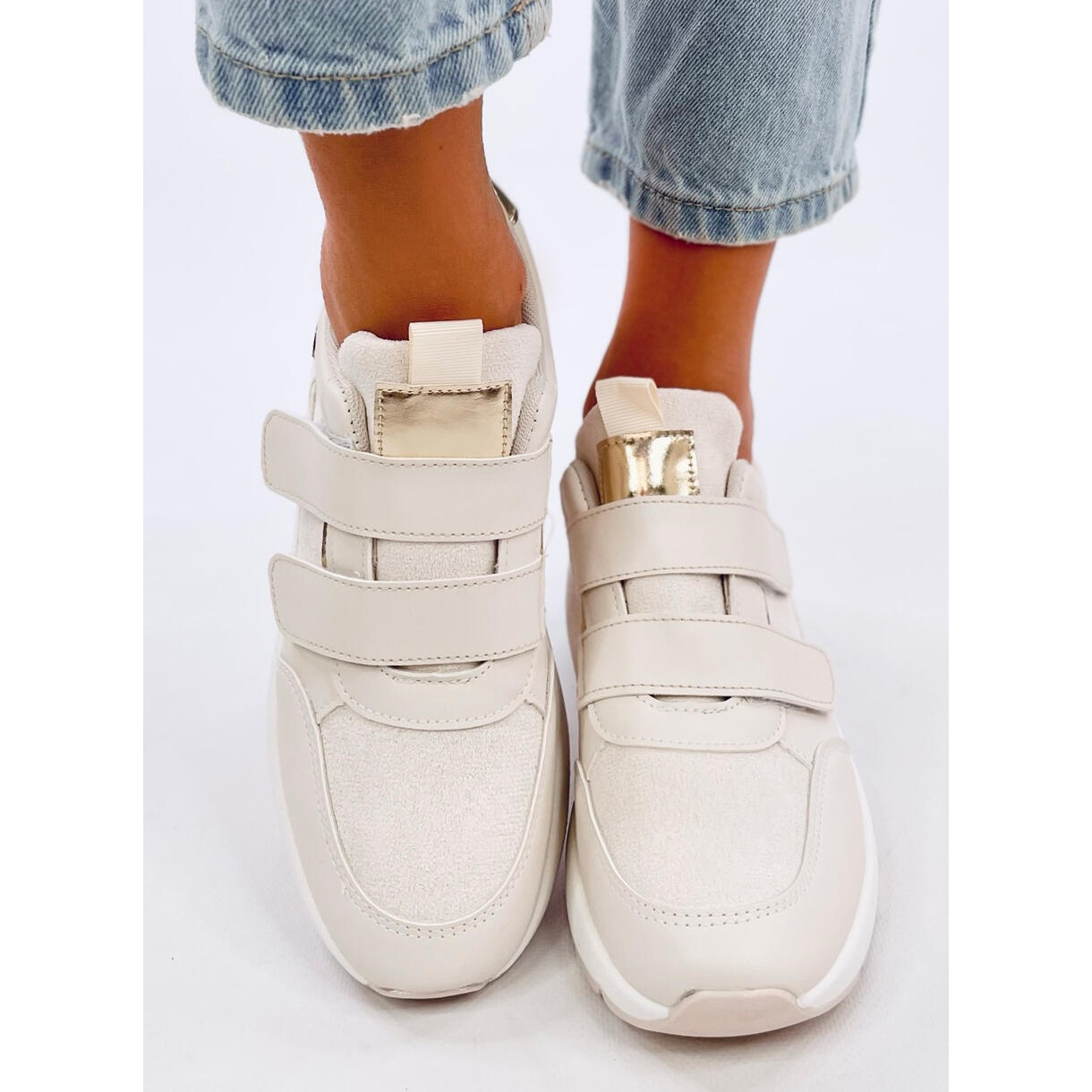 Des lignes fines, des couleurs beiges et un subtil jeu de brillance sont dus à l'association du cuir écologique avec des finitions imitant le daim écologique et des accents métalliques. Ces éléments donnent du caractère aux chaussures et rendent chaque tenue originale.