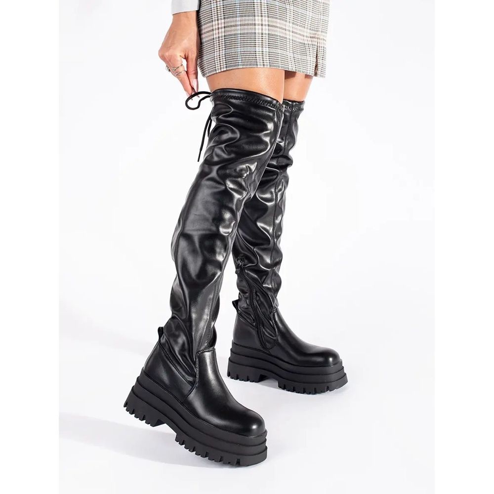 Ce modèle est caractérisé par un talon up construit et un nez rond, ce qui garantit une utilisation. La hauteur de la tige de 54 cm signifie que les mousquetaires atteignent le genou, ce qui allonge en outre les jambes optiquement. La plate-forme de 8 cm de haut vous permet de vous déplacer confortablement toute la journée, et une semelle en plastique lisse garantit la durabilité et la facilité de maintien.