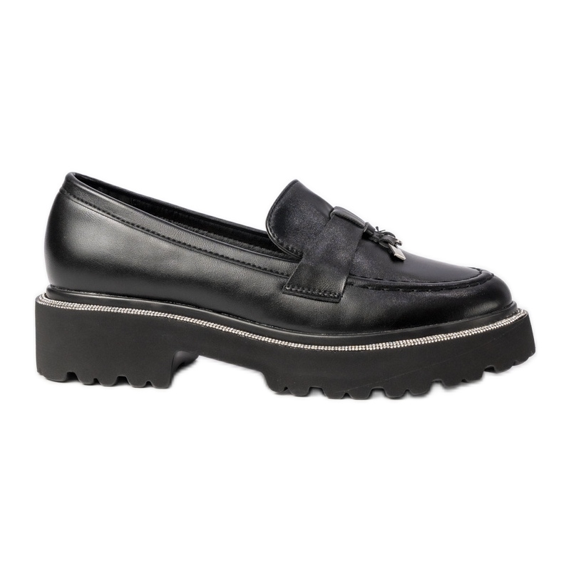 Ce qui fait que ces mocassins se démarquent, c'est une belle décoration à franges et des strass élégantes qui leur donnent un caractère luxueux. Grâce au motif lisse et à la couleur noire universelle, ils se mélangent bien avec les deux tenues décontractées, comme les jeans et un t-shirt, et de stylisations plus formelles avec une veste.