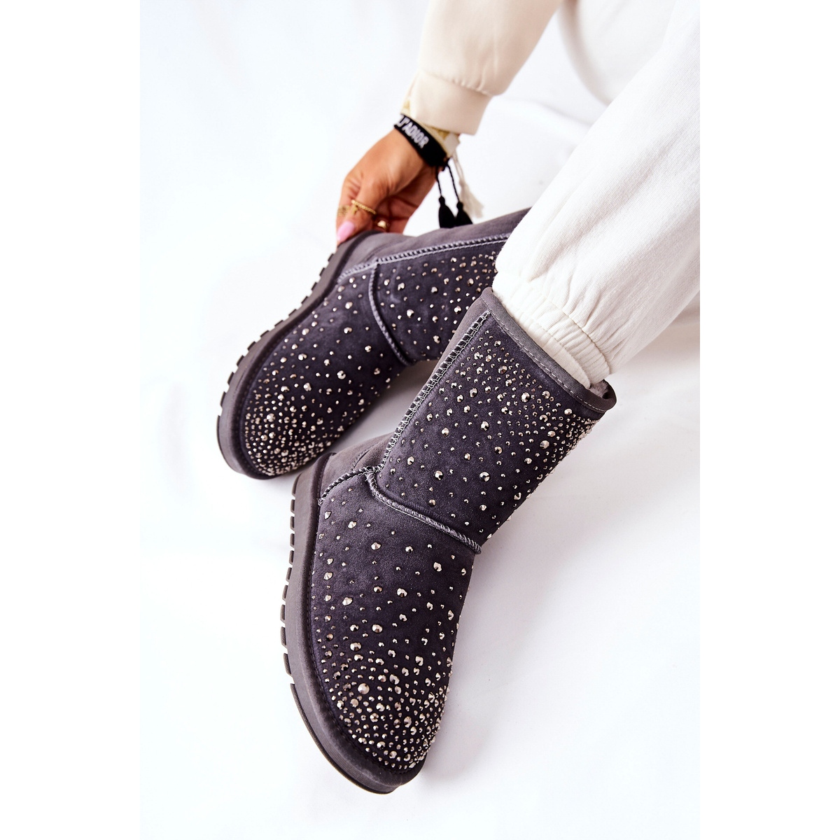 - Le daim naturel et les décorations avec des strass donnent un look élégant et à la mode.