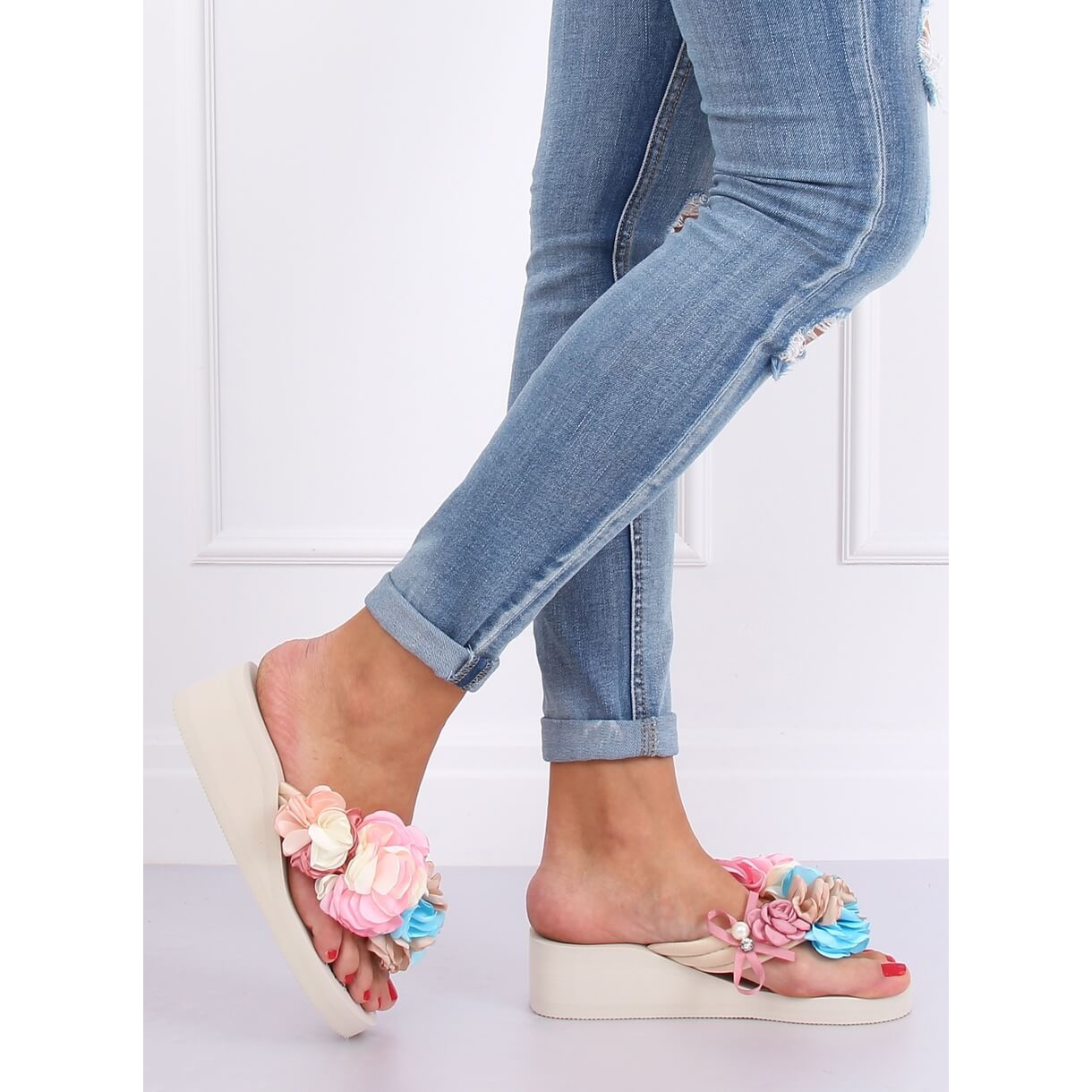 Nous vous présentons les tongs N-31 Beige avec semelle en mousse, qui deviendront sûrement votre accessoire d'été préféré ! Ces élégantes tongs compensées de 5 cm de hauteur sont la combinaison parfaite entre confort et style. Leur design unique attire l'attention grâce à de belles fleurs multicolores ornées de charmantes perles et de zircons brillants, ce qui fait de chaque pas un véritable plaisir.