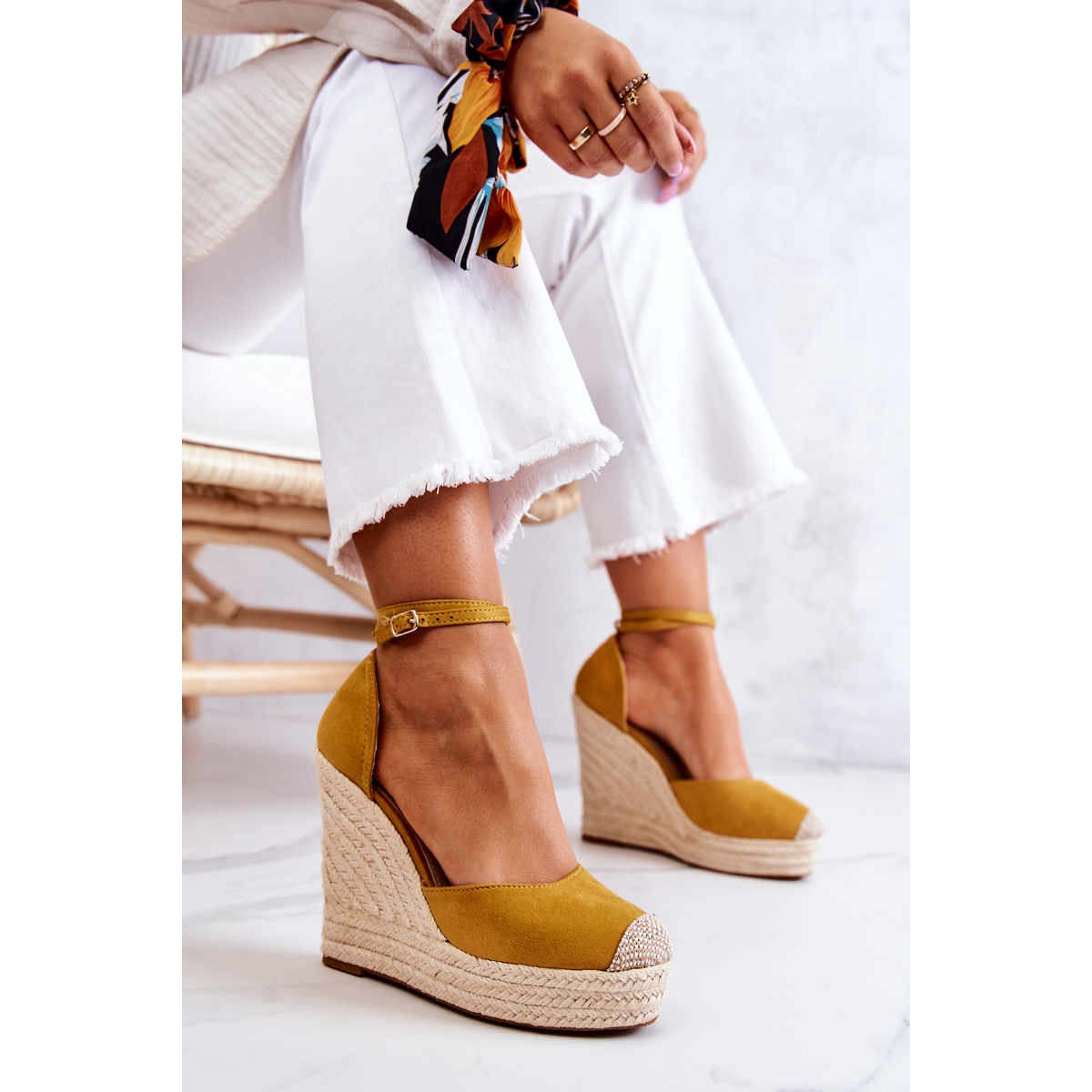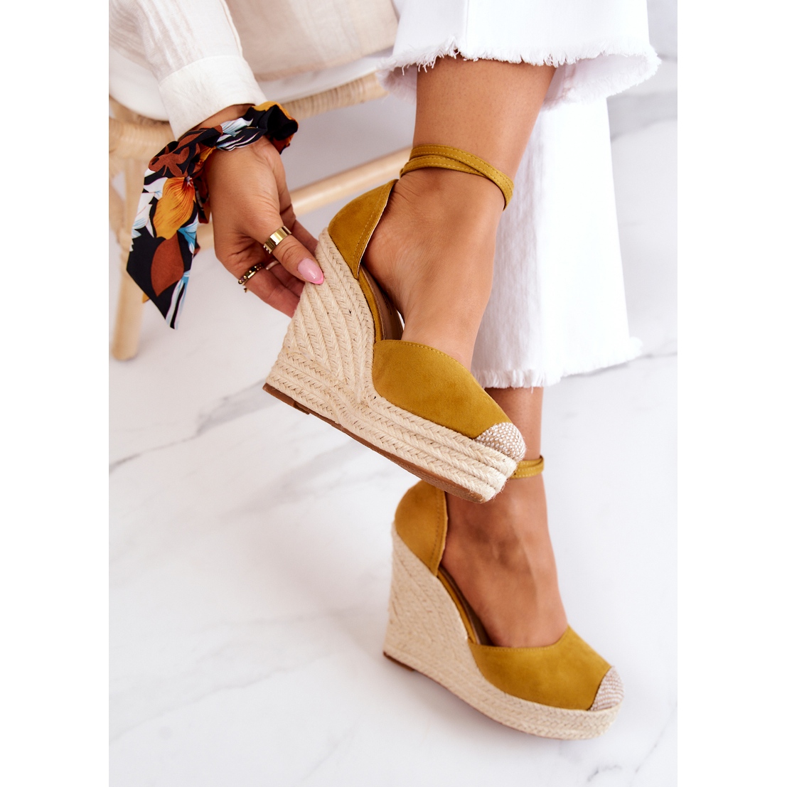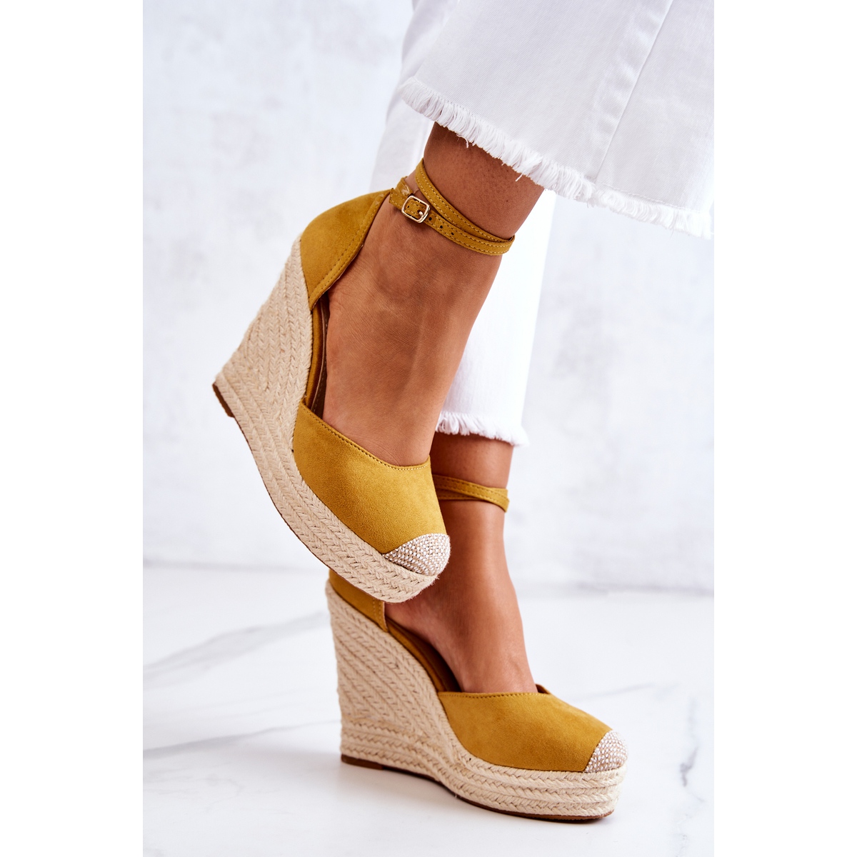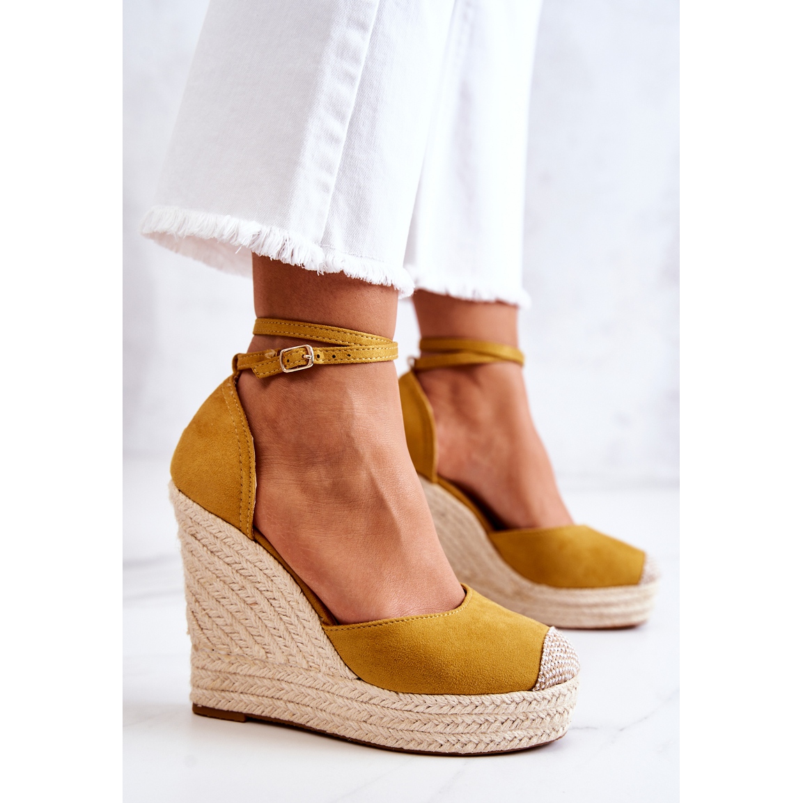 Découvrez les extraordinaires espadrilles compensées de la marque FM1, qui allient parfaitement style et confort. Ces superbes espadrilles jaunes, confectionnées en cuir écologique suédé, sont la quintessence d'un look estival qui attirera certainement l'attention et vous permettra de vous démarquer dans la foule.