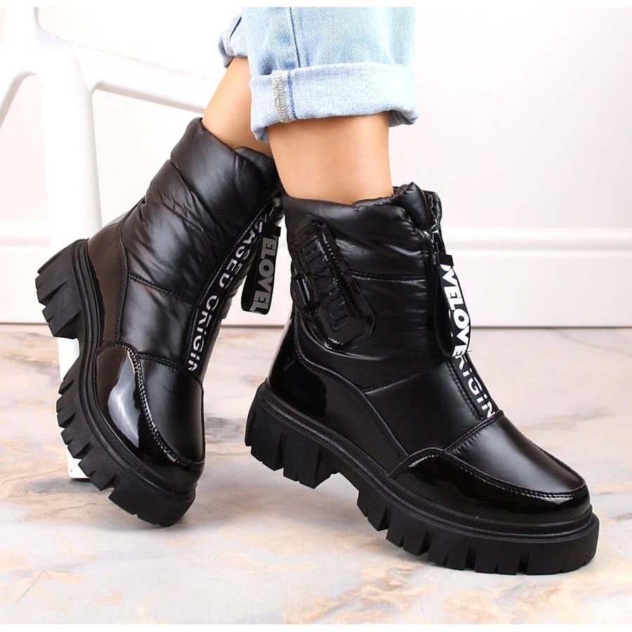 Le matériau extérieur est du similicuir verni, qui est non seulement visuellement attrayant, mais augmente également la durabilité des chaussures contre des conditions météorologiques défavorables. Une couche textile supplémentaire améliore la résistance à l'imprégnation et la fermeture éclair facilite l'enfilage et le retrait rapide des bottes.