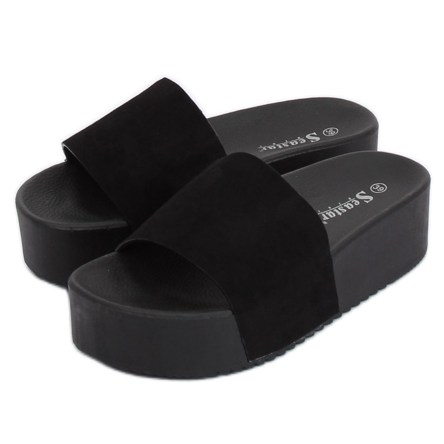 Noir CK76P Les tongs noires à semelle haute sont un incontournable du dressing de chaque femme ! Ces tongs élégantes se distinguent par une semelle haute tendance de 5 cm de haut, qui ajoute de la légèreté à chaque pas. Leur semelle intérieure profilée assure un confort de port même pendant une longue période, et la large sangle maintient parfaitement le pied, ce qui se traduit par stabilité et confiance lors de la marche.