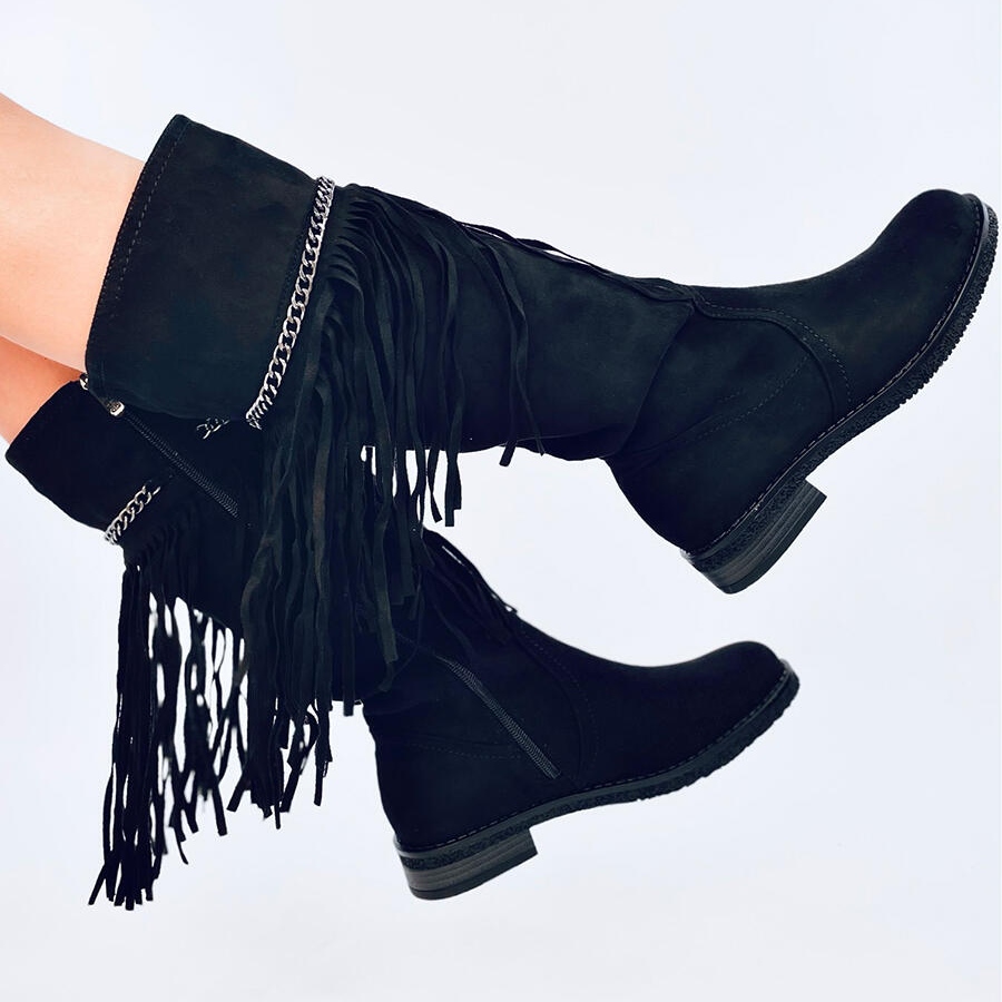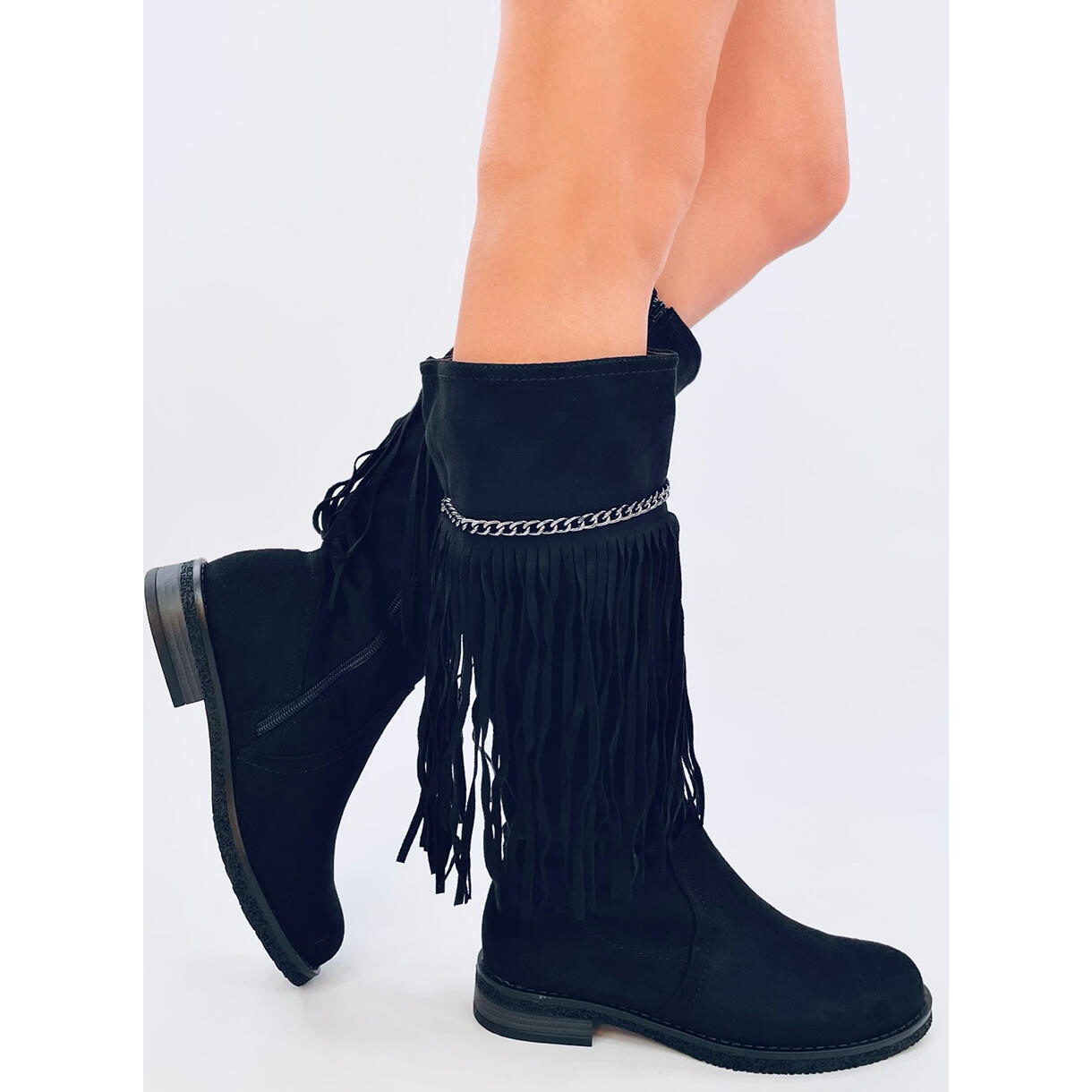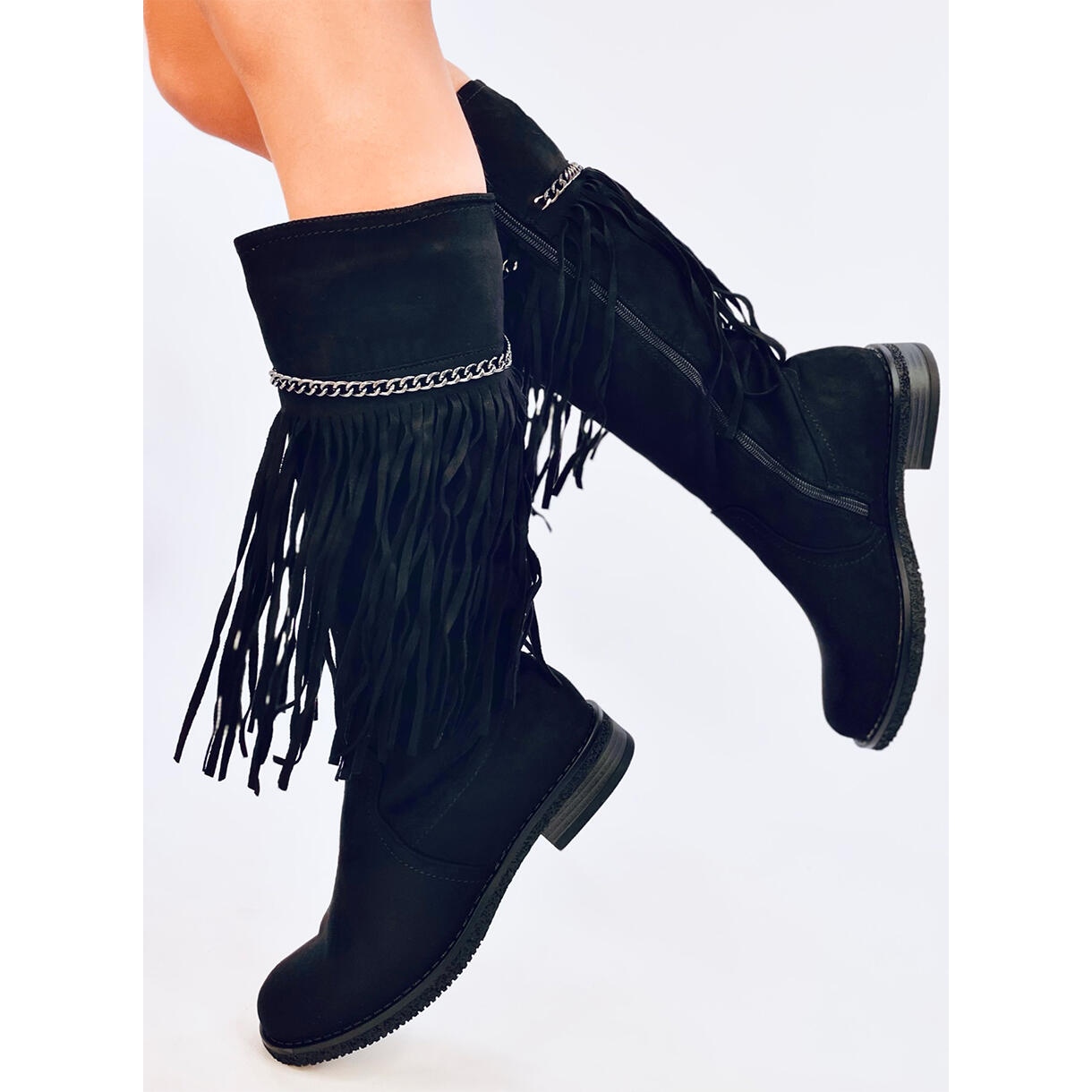 L'accent design qui distingue ce modèle sont les franges de style bohème, qui confèrent à la chaussure un caractère unique. Un élément décoratif supplémentaire est une chaîne impressionnante, grâce à laquelle les bottes attirent l'attention et reflètent les dernières tendances de la mode.