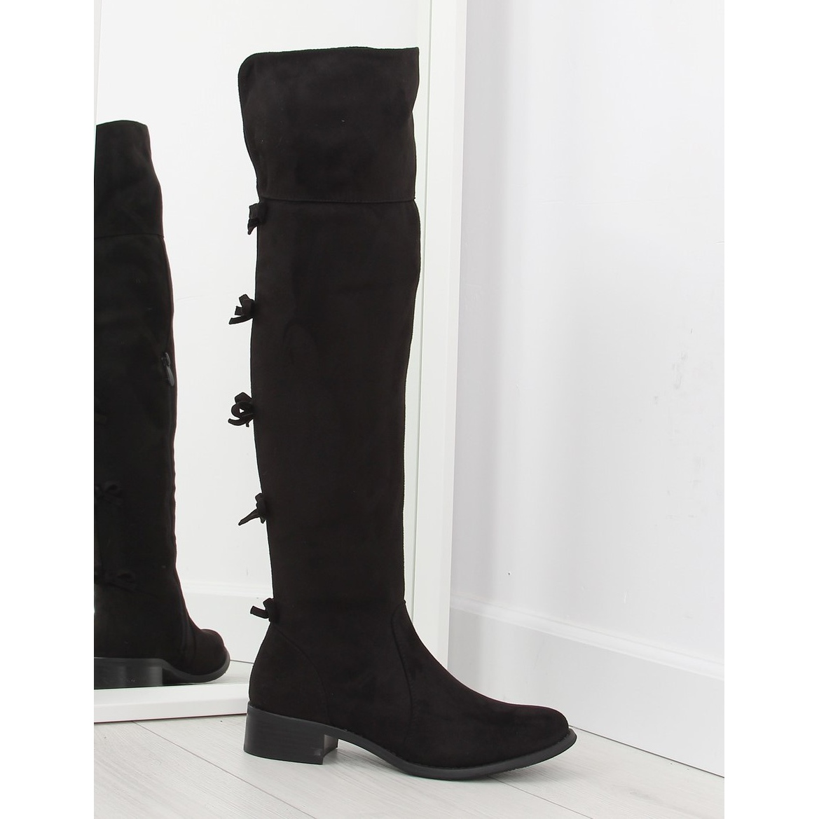 Mousquetaires classiques avec un accent subtil et féminin. La tige haute arrivant au-dessus du genou met en valeur la jambe et les nœuds à l'arrière cassent la coupe traditionnelle, ajoutant élégance et légèreté. L'intérieur est doublé d'une fourrure délicate pour plus de chaleur, et la fermeture éclair à l'intérieur permet de l'enfiler facilement et rapidement. Fabriqué en daim écologique - un look élégant sans sacrifices.