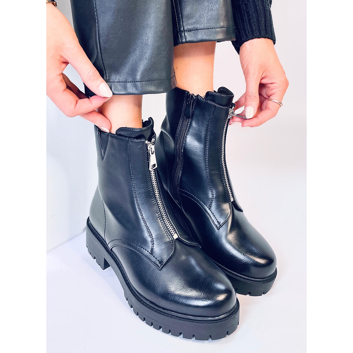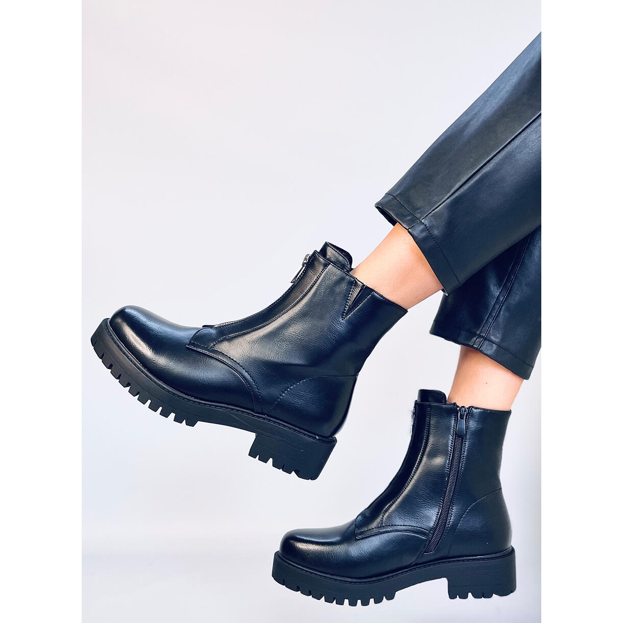 Les bottes avec protection et fermeture éclair sont des chaussures pour femmes de style militaire à la mode. Ils sont fabriqués dans un cuir noir écologique, lisse et qui s'accorde avec tout. Les chaussures ont un bout rond, un talon plat de 4 cm de haut et arrivent au-dessus de la cheville. La semelle est en matière synthétique. Un élément important de la chaussure est la fermeture éclair sur le devant, qui leur donne un look unique, ainsi que la fermeture éclair sur le côté de la tige - c'est la fermeture éclair qui sert à fermer les chaussures. Les bottes sont doublées de mousse, ce qui permet de les porter même les jours les plus froids. Les chaussures sont neuves, livrées dans l'emballage d'origine du fabricant. De par leur style universel, ces chaussures peuvent être portées au quotidien, avec des styles variés.