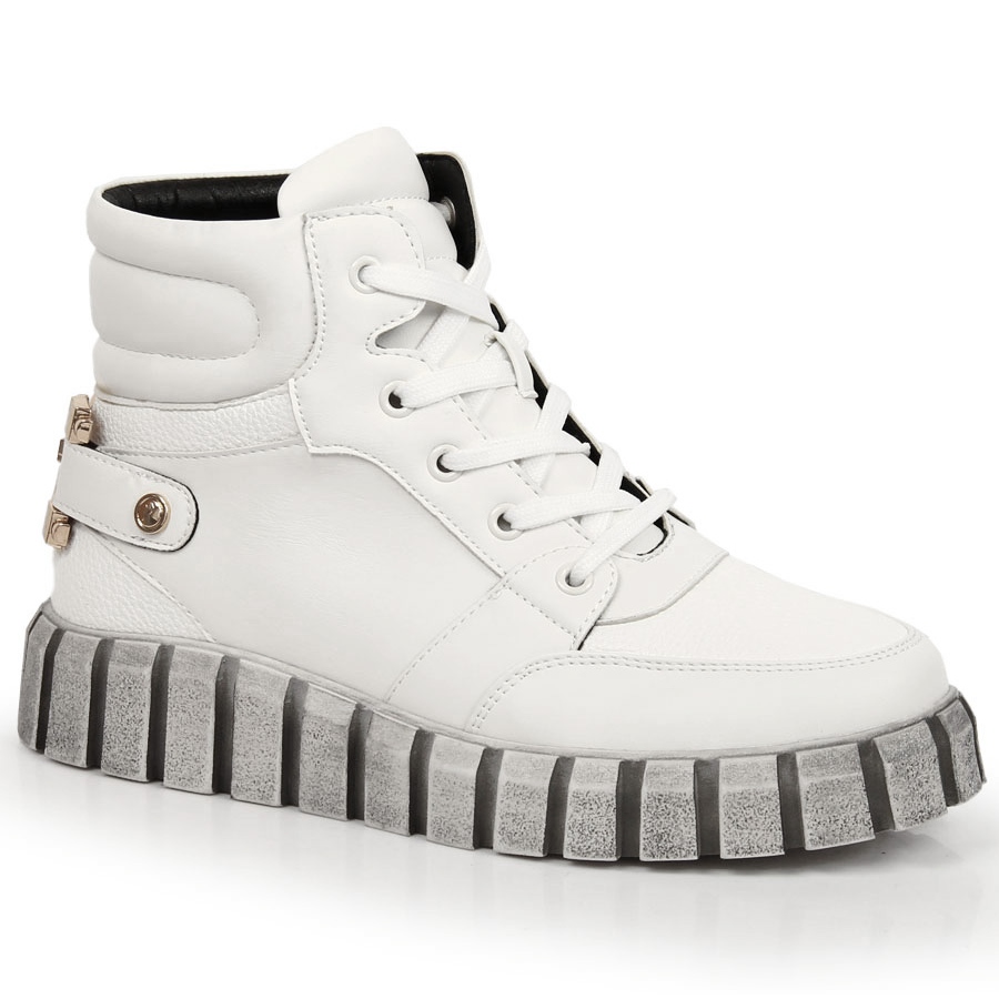 La partie extérieure est en cuir écologique d'une élégante couleur blanche, ce qui la rend parfaitement adaptée aux tendances actuelles. L'intérieur des chaussures est fini avec un chignon et un manteau en peau de mouton, ce qui assure une agréable sensation de chaleur et un confort de port même les jours les plus froids. La hauteur de la tige est d'environ 11 cm, ce qui apporte du caractère et souligne subtilement la ligne de cheville.