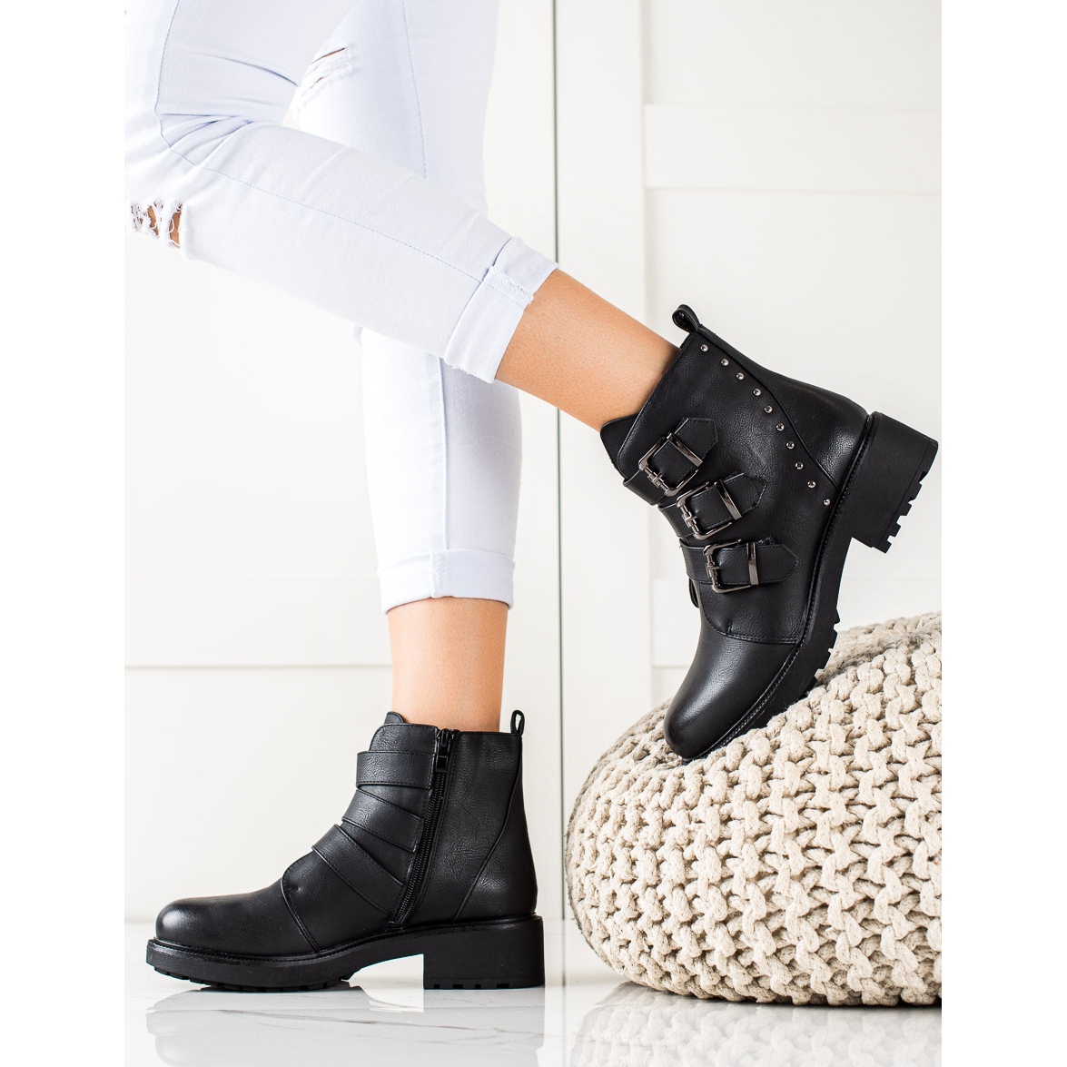 Le style décontracté aux accents rock est complété par des boucles décoratives, des strass et des clous qui attirent l'attention et donnent du caractère à n'importe quel style. La largeur supérieure de 20 cm et la hauteur supérieure de 12 cm permettent aux chaussures de s'adapter parfaitement à la jambe, mettant en valeur la silhouette féminine.