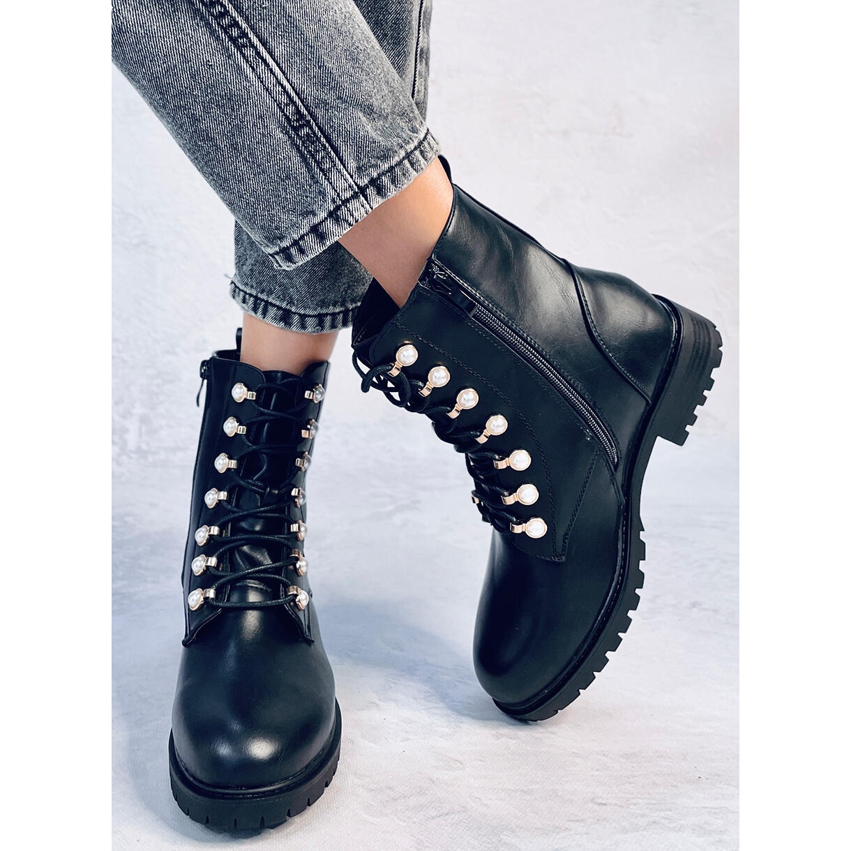 Les travailleurs avec des perles noires brillantes - noires, des bottes pour femmes en dentelle sur un protecteur qui combinent la mode et le confort. La coupe classique et intemporelle en noir universel est décorée de perles subtiles et de strass, grâce à laquelle les chaussures sont excellentes pour les stylisations quotidiennes et les looks plus de sortie.