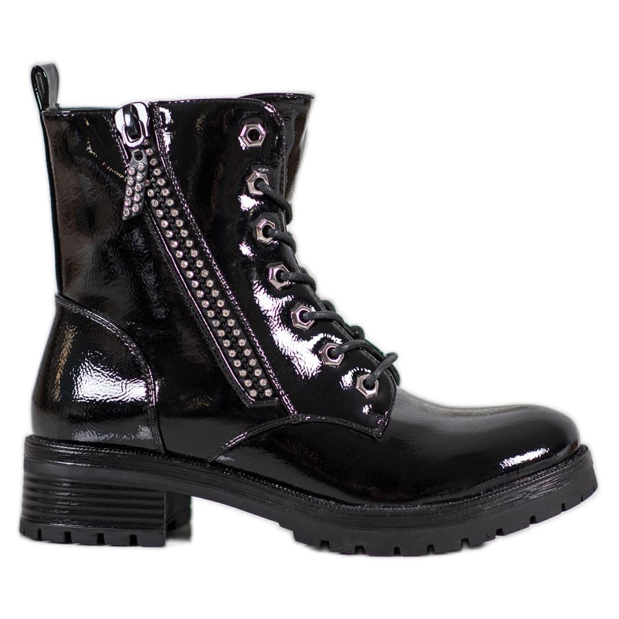 Nous vous présentons des ouvriers uniques de la marque SHELOVET, qui allient style rock et finition élégante. Ces chaussures noires à la surface brillante sont le choix parfait pour les femmes qui veulent se démarquer.