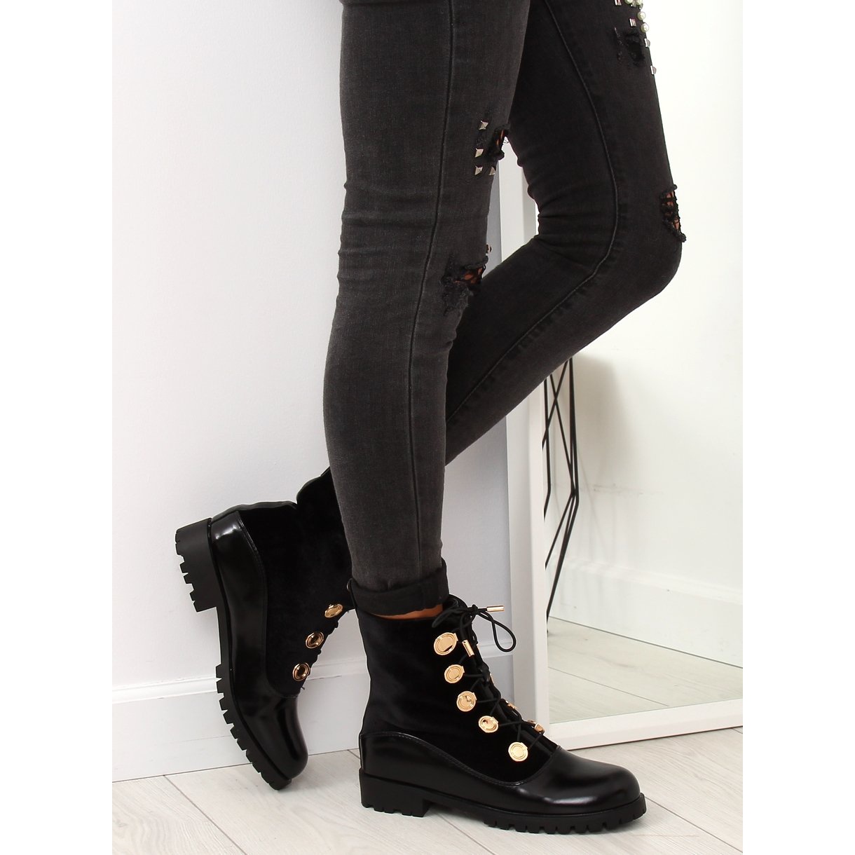 Ces bottines noires disposent d'un talon plat de 2,5 cm, qui garantit un confort extraordinaire au quotidien. Ils sont parfaits pour un style quotidien, leur donnant un caractère militaire. Le motif lisse les rend universels et faciles à combiner avec diverses tenues.