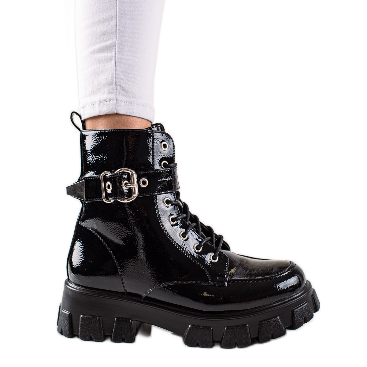 Nous vous présentons des bottes de travail en cuir verni à boucle d'une élégante couleur noire de la marque TRENDI, qui deviendront certainement votre élément préféré de votre garde-robe pour la prochaine saison automne/hiver. Ces bottines tendance allient un style rock audacieux à un caractère décontracté, s'adaptant parfaitement aux dernières tendances.