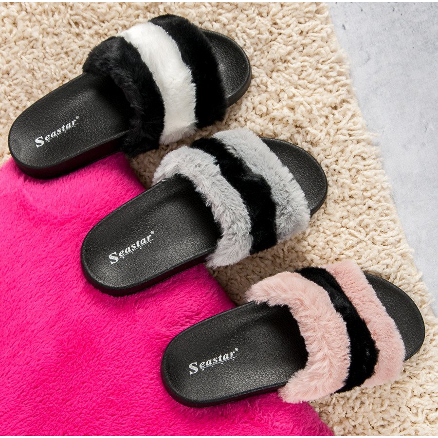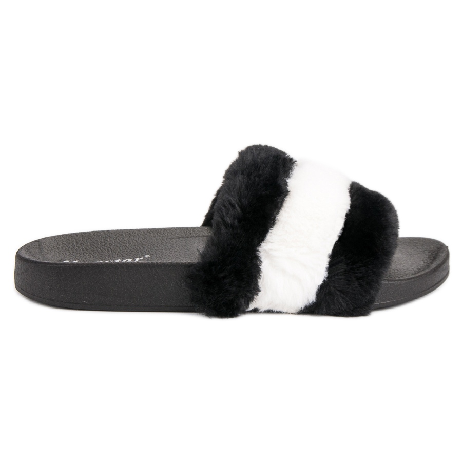 Les tongs Seastar avec fourrure, noires, sont le choix parfait pour les femmes qui apprécient le confort et le style à la maison. Ces claquettes à enfiler se distinguent non seulement par leur élégante couleur noire, mais aussi par leur fourrure originale à rayures blanches et noires, qui leur confère un caractère unique. Fabriqués en caoutchouc de haute qualité, ils garantissent durabilité et résistance, ce qui leur permet de durer longtemps.