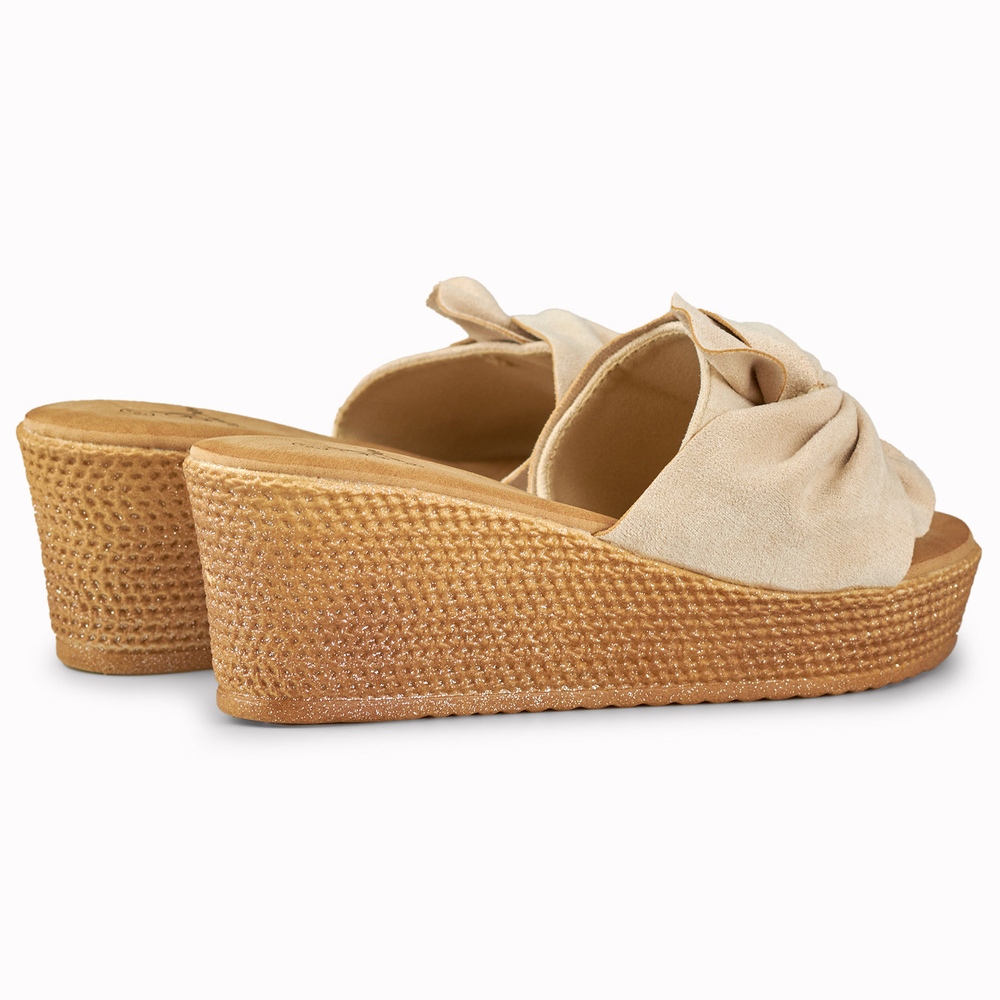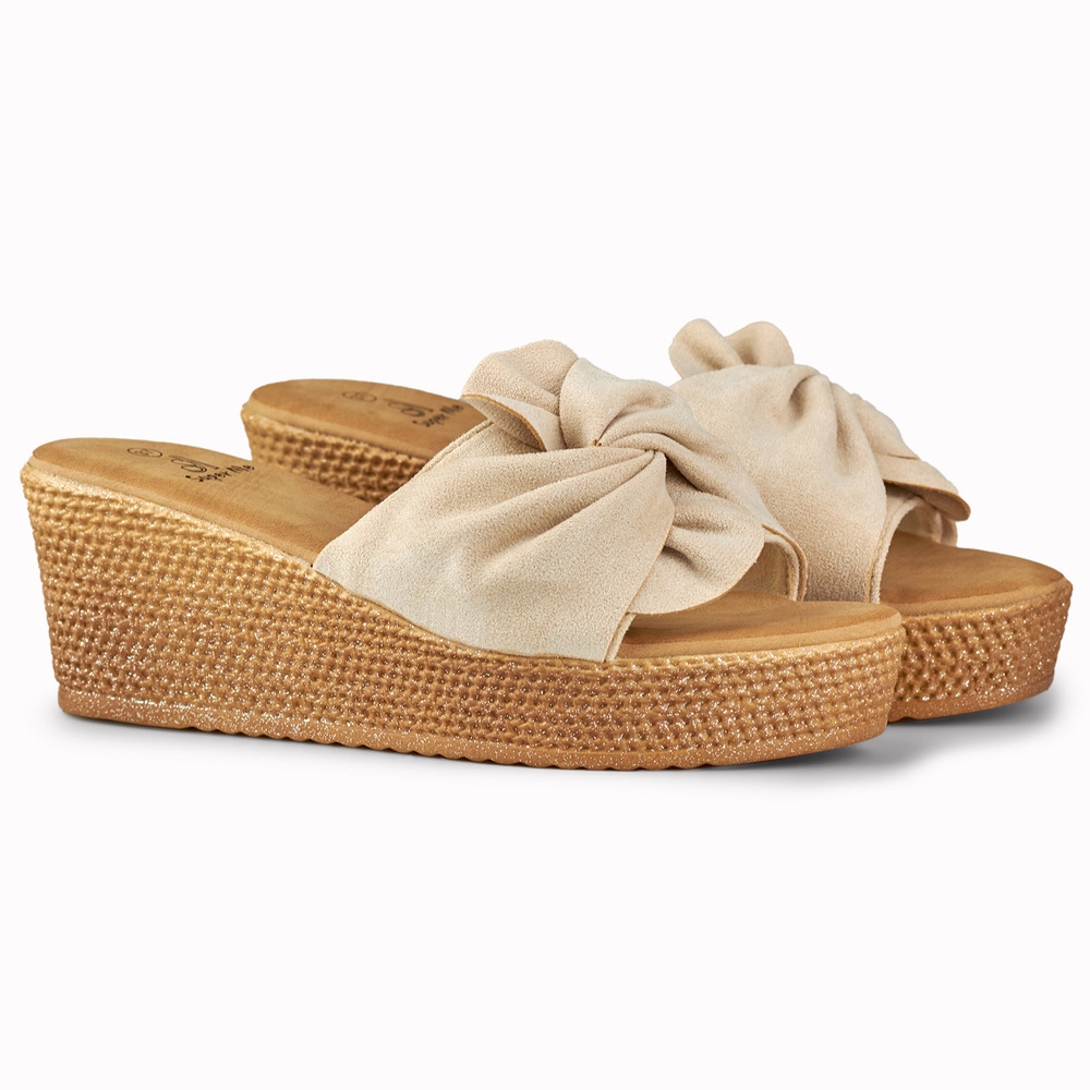 Détails: Pantoufles beiges pour femmes sur un talon compensé confortable