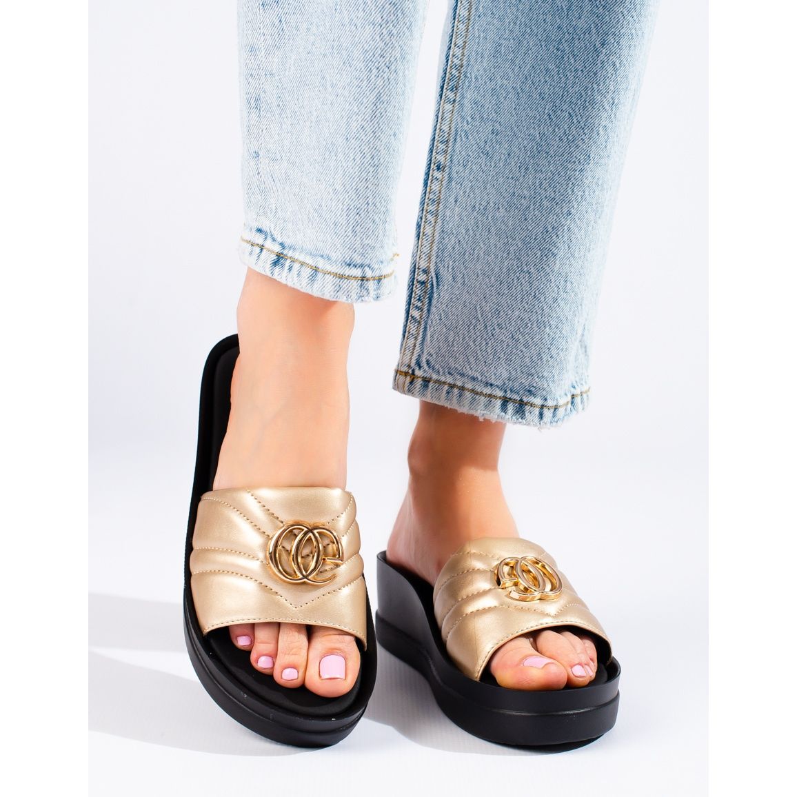 Fatigué des compromis entre style et confort ? Découvrez les tongs compensées dorées pour femmes W. Potocki - vos nouveaux compagnons parfaits pour le printemps et l'été. Ces mules à enfiler s'intégreront facilement à votre look de tous les jours et ajouteront un peu de brillance grâce à leur version dorée.
