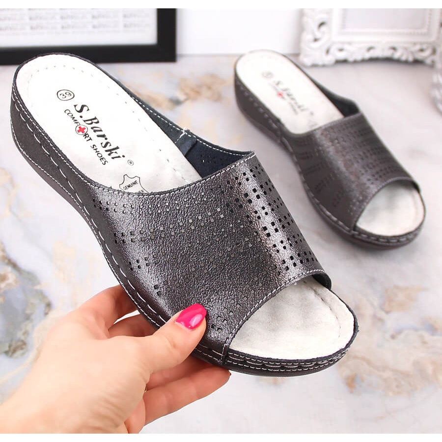 S.Barski Pantoufles confortables en cuir pour femmes sur un talon compensé en étain S.Barski BN292 gris