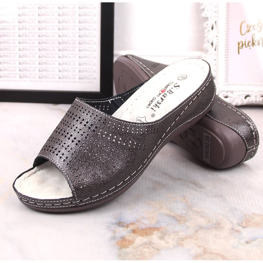Les pantoufles confortables en cuir pour femmes avec une cale en étain S.Barski BN292, grises, sont une proposition idéale pour les femmes qui apprécient une combinaison de style et de confort dans un seul produit. Produites par un fabricant respecté, S.Barski, ces tongs s'intègrent parfaitement dans la catégorie des chaussures décontractées de tous les jours, s'adaptant parfaitement à différents styles d'été.