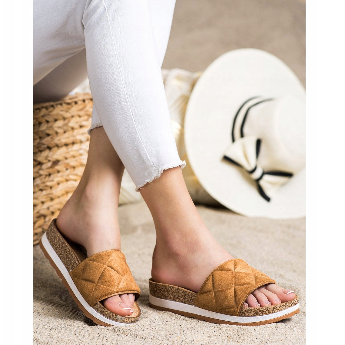 Ces tongs ont un talon ouvert et une fermeture à enfiler, ce qui les rend faciles à enfiler et à enlever. Fabriqués en imitation daim de haute qualité, ils sont dotés d'une doublure textile douce, qui garantit un confort de port tout au long de la journée. La plateforme de 4 cm de hauteur soulève légèrement les pieds, soulignant la silhouette féminine et offrant un soutien supplémentaire.