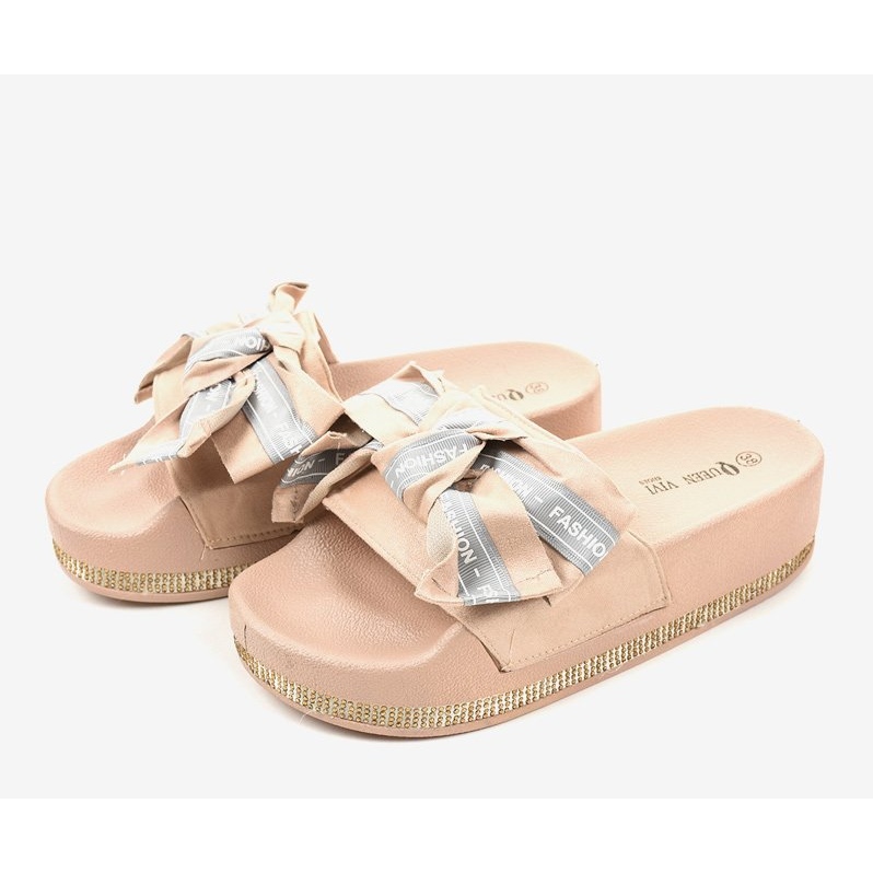Nous vous présentons les tongs mode décontractées beiges 218-207 - la combinaison parfaite d'élégance et de confort pour les femmes modernes. Fabriquées en cuir éco-suède dans une subtile nuance de beige, ces tongs sont le choix parfait pour toute occasion. Leur design minimaliste attire l'attention grâce à la large bride au-dessus des orteils, ornée d'un grand nœud avec un élégant ruban gris.