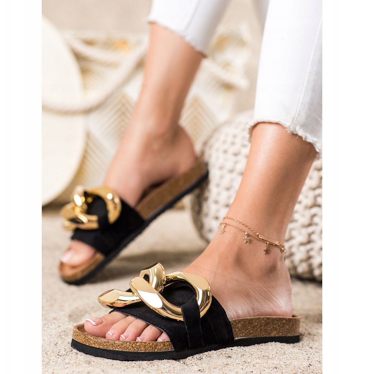 Les tongs sont fabriquées à partir de matériaux de haute qualité : la partie supérieure est en imitation daim et l'intérieur est composé d'une combinaison de cuir écologique et de textile. De plus, les décorations dorées et les strass constituent un accent élégant qui distingue ce modèle et lui confère un caractère tendance.