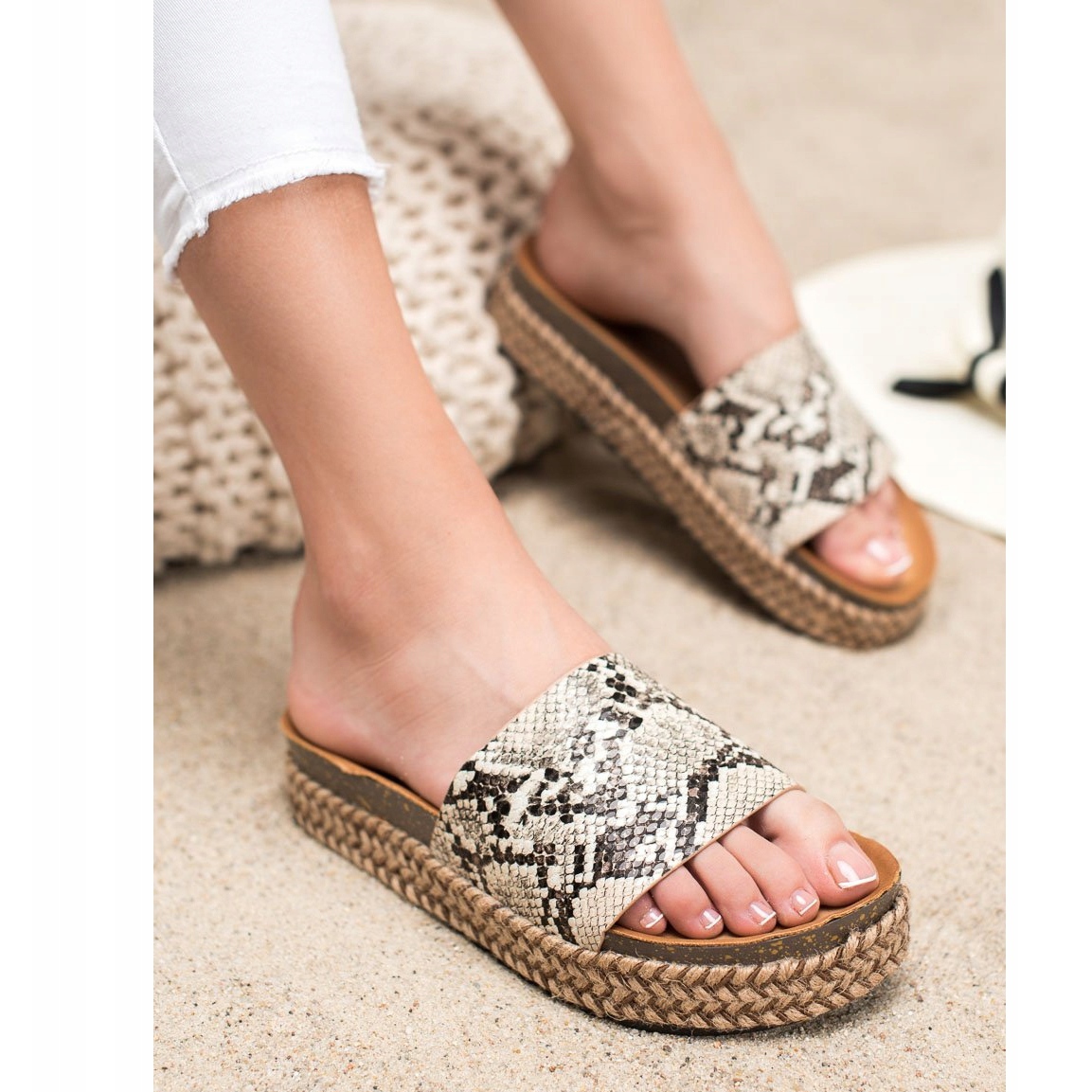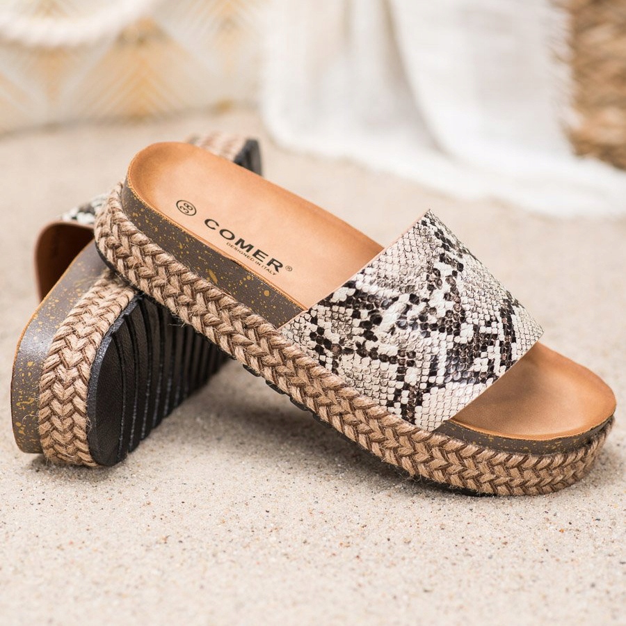 Nous vous présentons les tongs à plateforme de la marque Comer, qui séduisent par leur design audacieux et leur motif animalier. La bande décorative, ressemblant à une peau de serpent, attire le regard avec un motif multicolore et chatoyant qui s'adapte parfaitement au soleil et au climat estival.