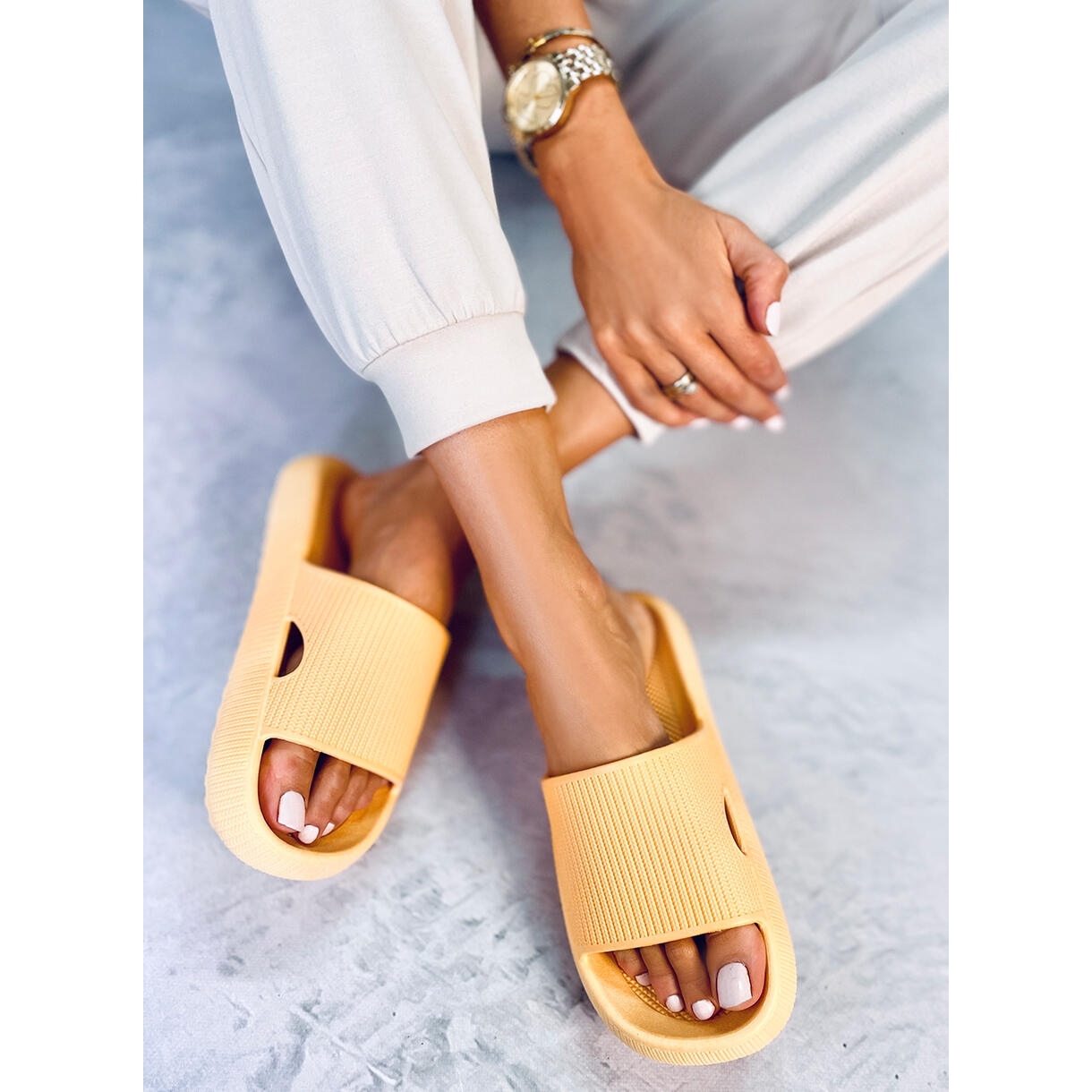La couleur jaune unique ajoute de l'énergie et de l'optimisme, introduisant une note fraîche à votre look estival. La finition lisse des tongs leur permet d'être facilement combinées avec différents styles - des shorts et t-shirts décontractés aux robes d'été légères.