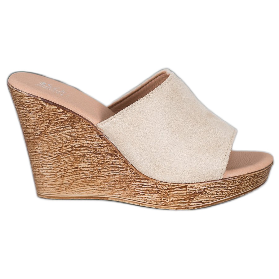 La tige des chaussures est constituée d'une large sangle, assurant un maintien stable du pied, et le cuir suédé écologique dans une subtile teinte beige ajoute du chic. Une cale de 10,5 cm de hauteur, en matière synthétique marron, non seulement affine optiquement les jambes, mais assure également un confort lors de longues marches, grâce à une plateforme de 2,5 cm de hauteur.