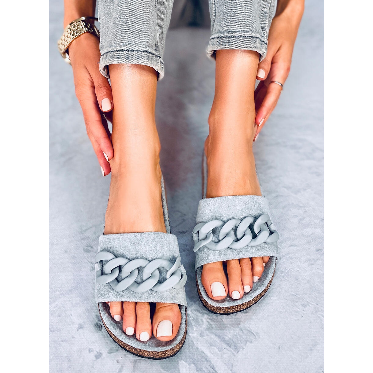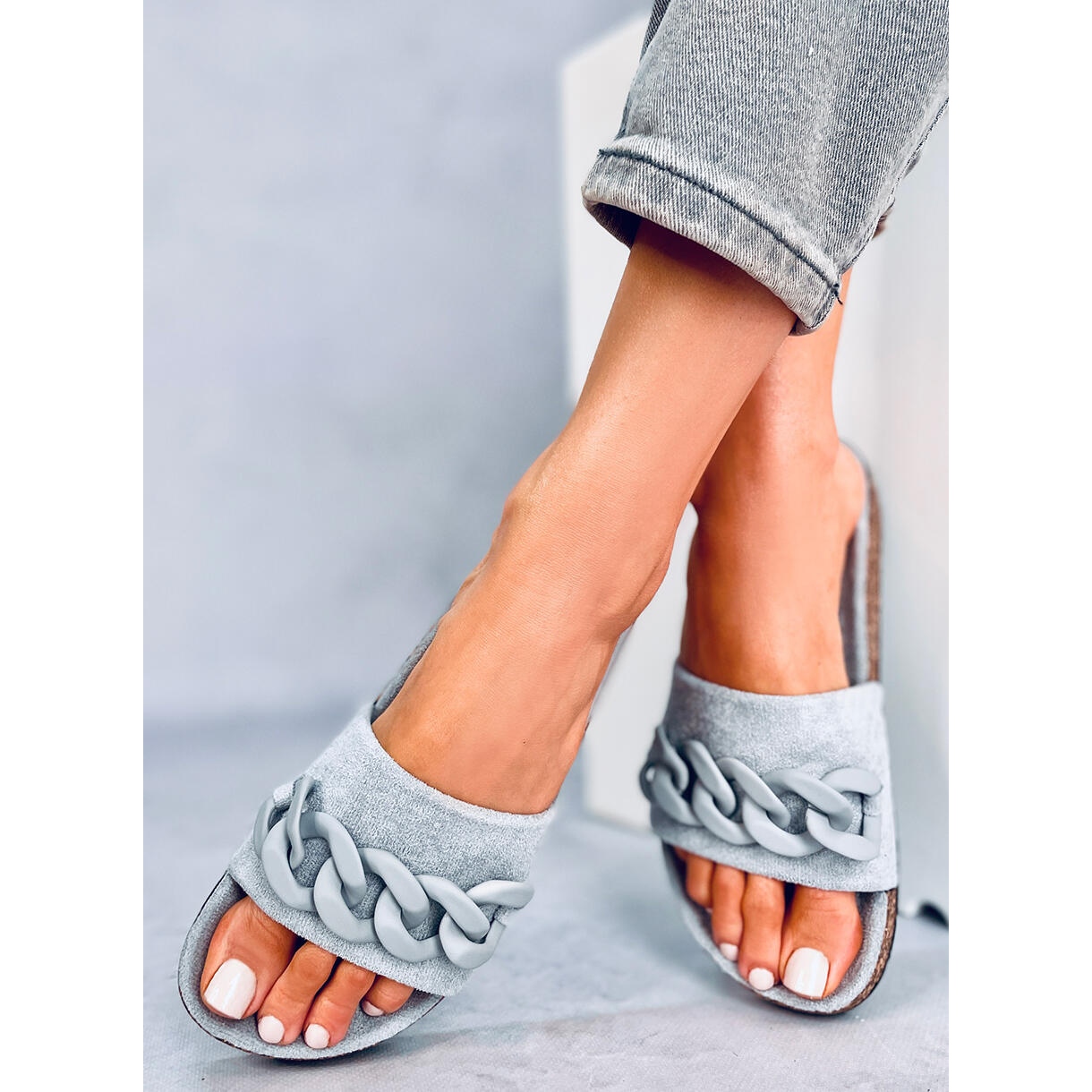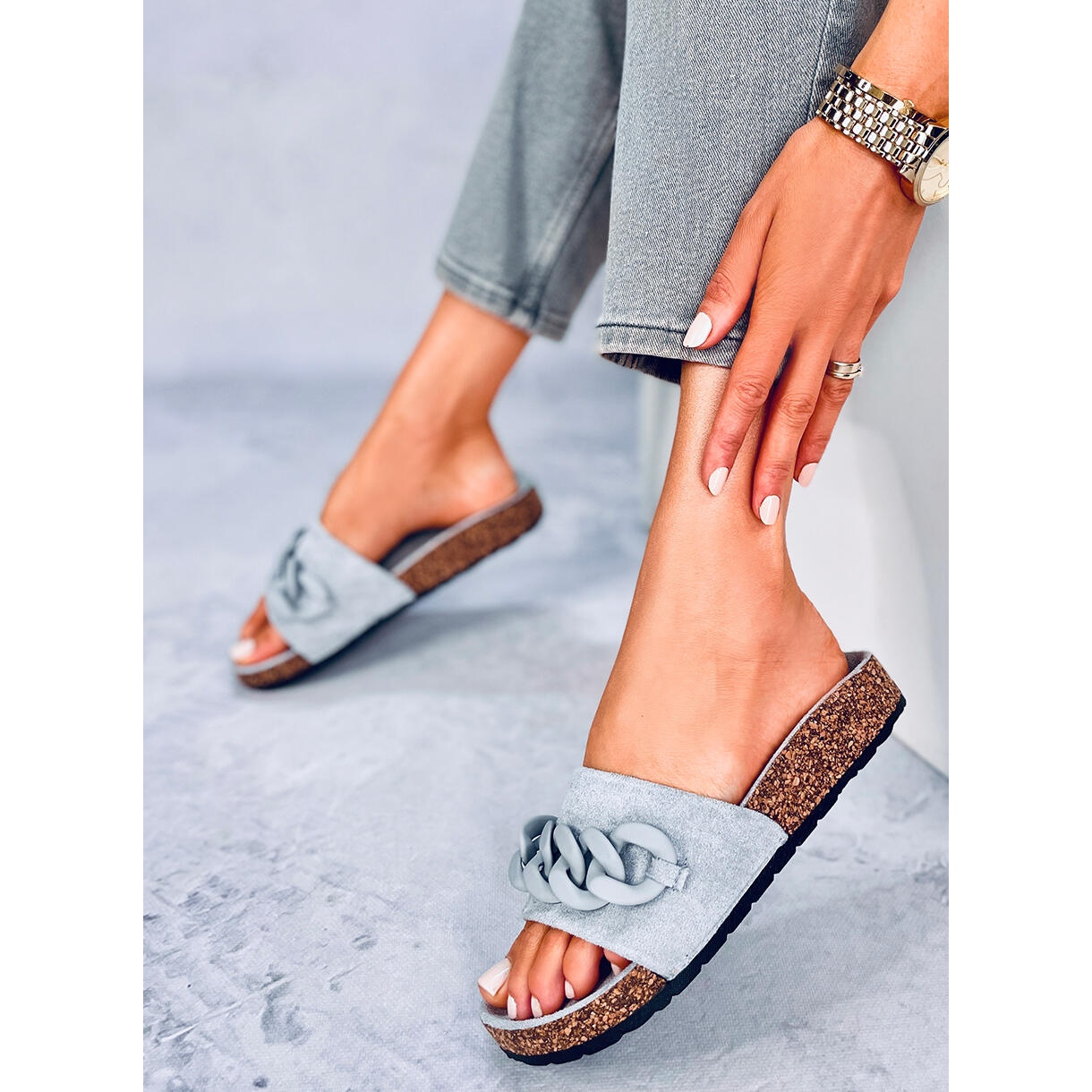 Découvrez l'élégance estivale avec les claquettes en liège Jarvis Grey avec une chaîne grise. Ces tongs pour femmes uniques, fabriquées en daim écologique de haute qualité, allient style et confort, parfaites pour un usage quotidien. La large sangle et l'insert intérieur profilé offrent un confort extraordinaire à chaque pas, vous permettant ainsi de parcourir librement de longues distances.