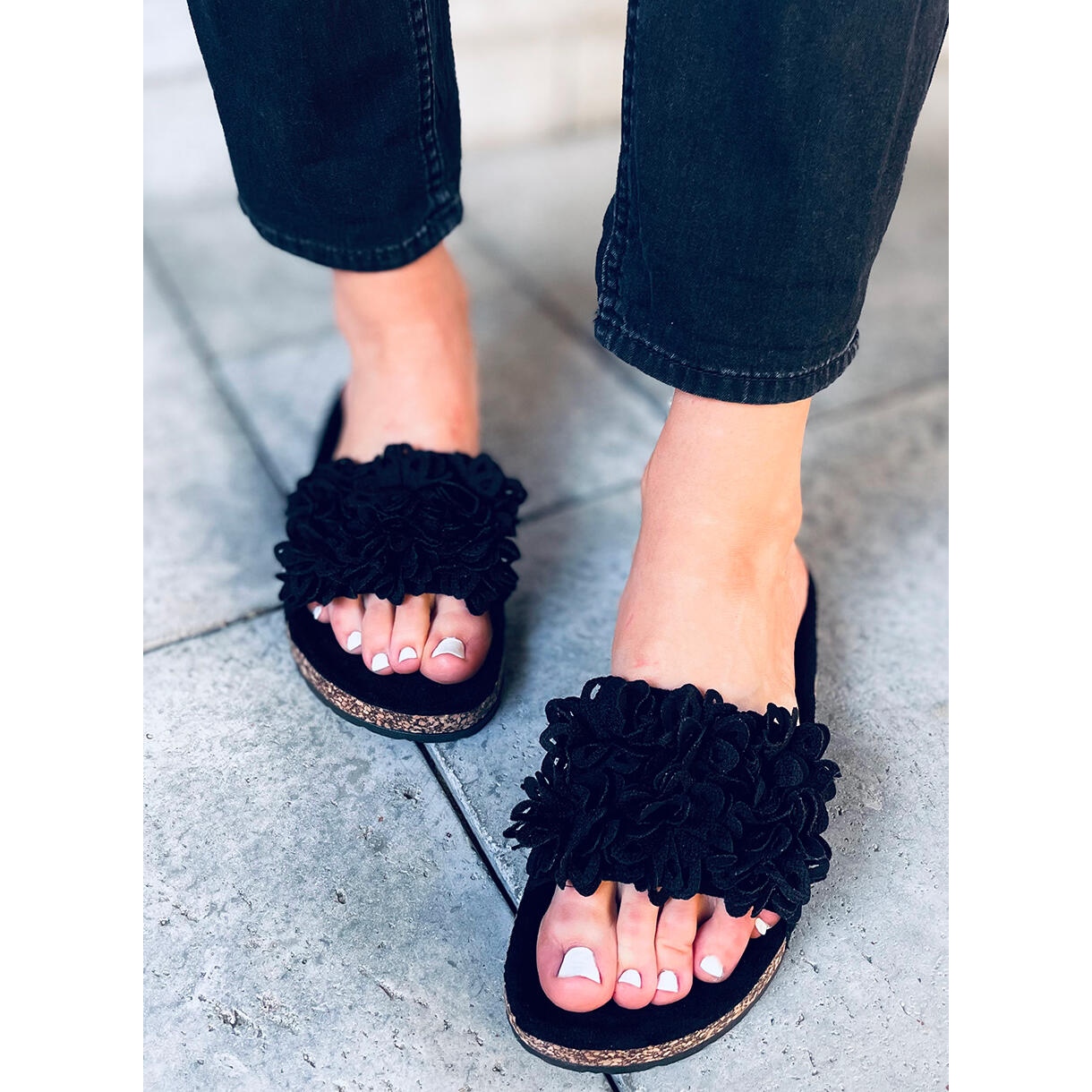Découvrez les tongs d'été parfaites - les tongs en liège Berry Black en noir, qui allient élégance et confort. Ces tongs pour femmes, fabriquées en daim écologique de haute qualité, attirent l'attention avec un motif floral subtil qui ajoutera du charme à n'importe quel style estival.
