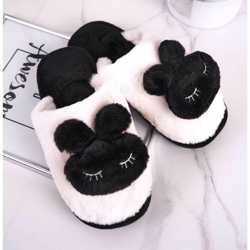 Pantoufles Femme en Fourrure de Lapin Noir blanc